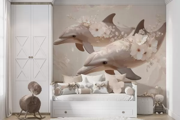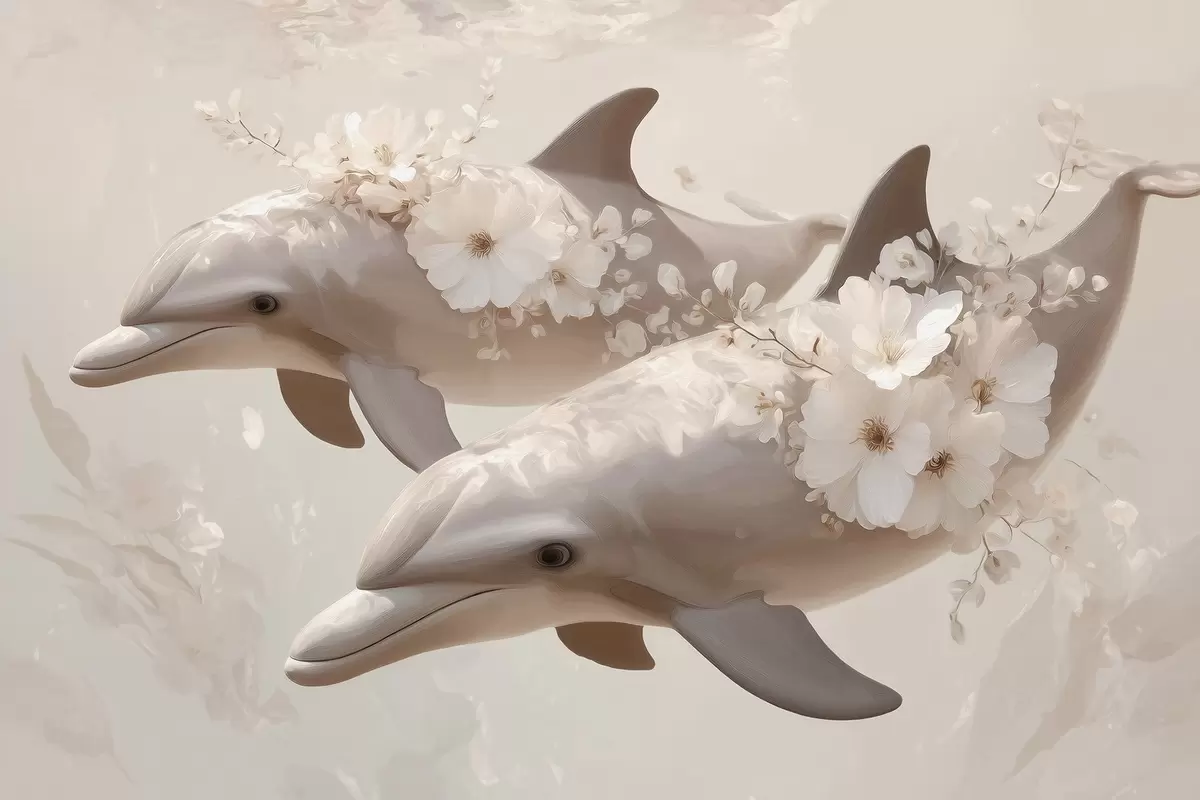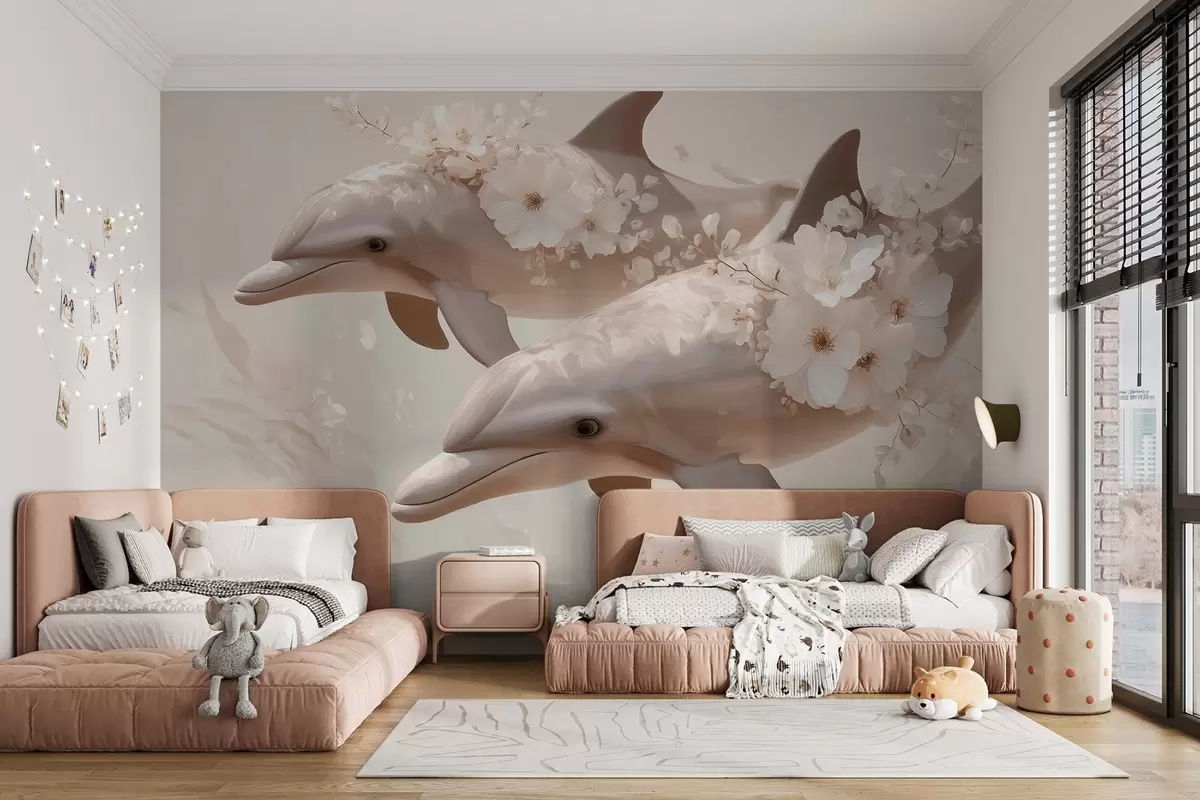 Dolphins in an ocean of delicate flowers and soft light - Wall mural (No. w09666)