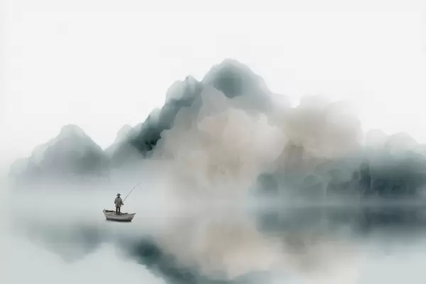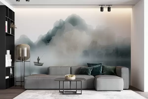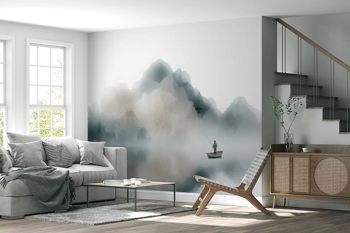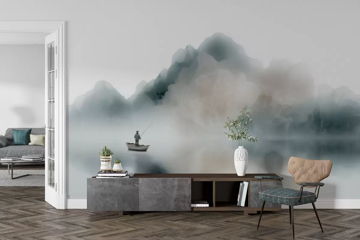 Mountain landscape with a boat and fisherman dissolving into soft mist - Wall mural (No. w09678)