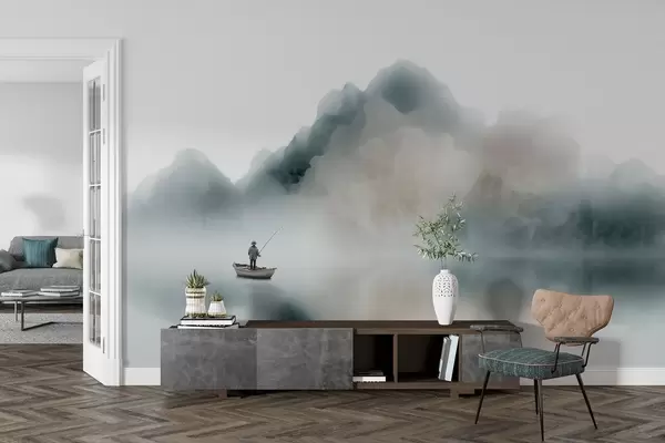 Mountain landscape with a boat and fisherman dissolving into soft mist - Wall mural (No. w09678)