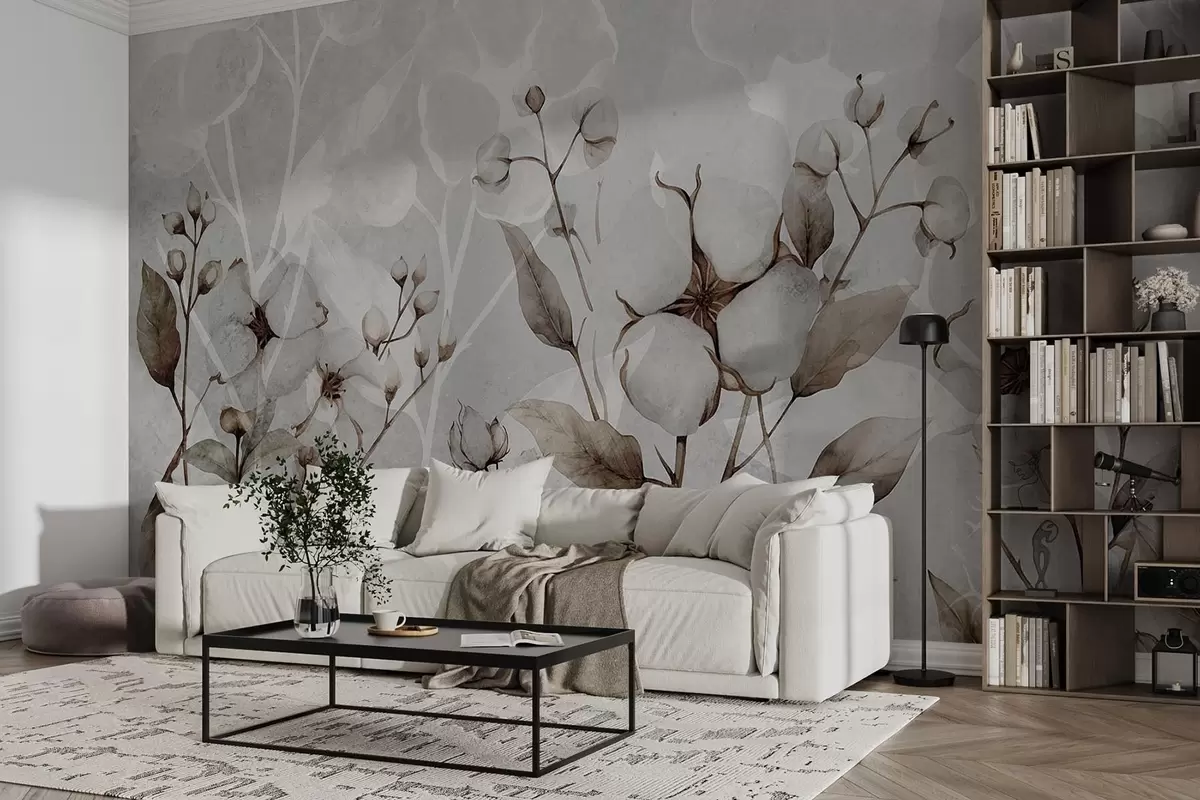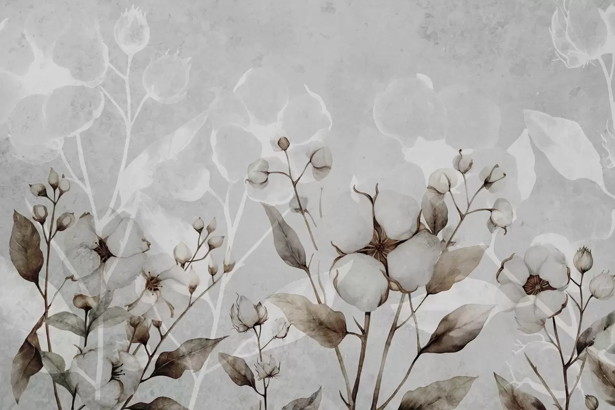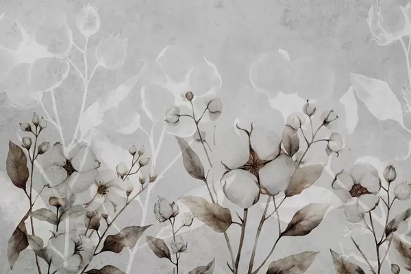 Large cotton flowers on a light gray background - Wall mural (No. w09691)