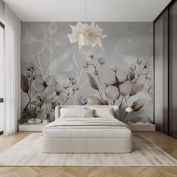 Large cotton flowers on a light gray background - Wall mural (No. w09691)