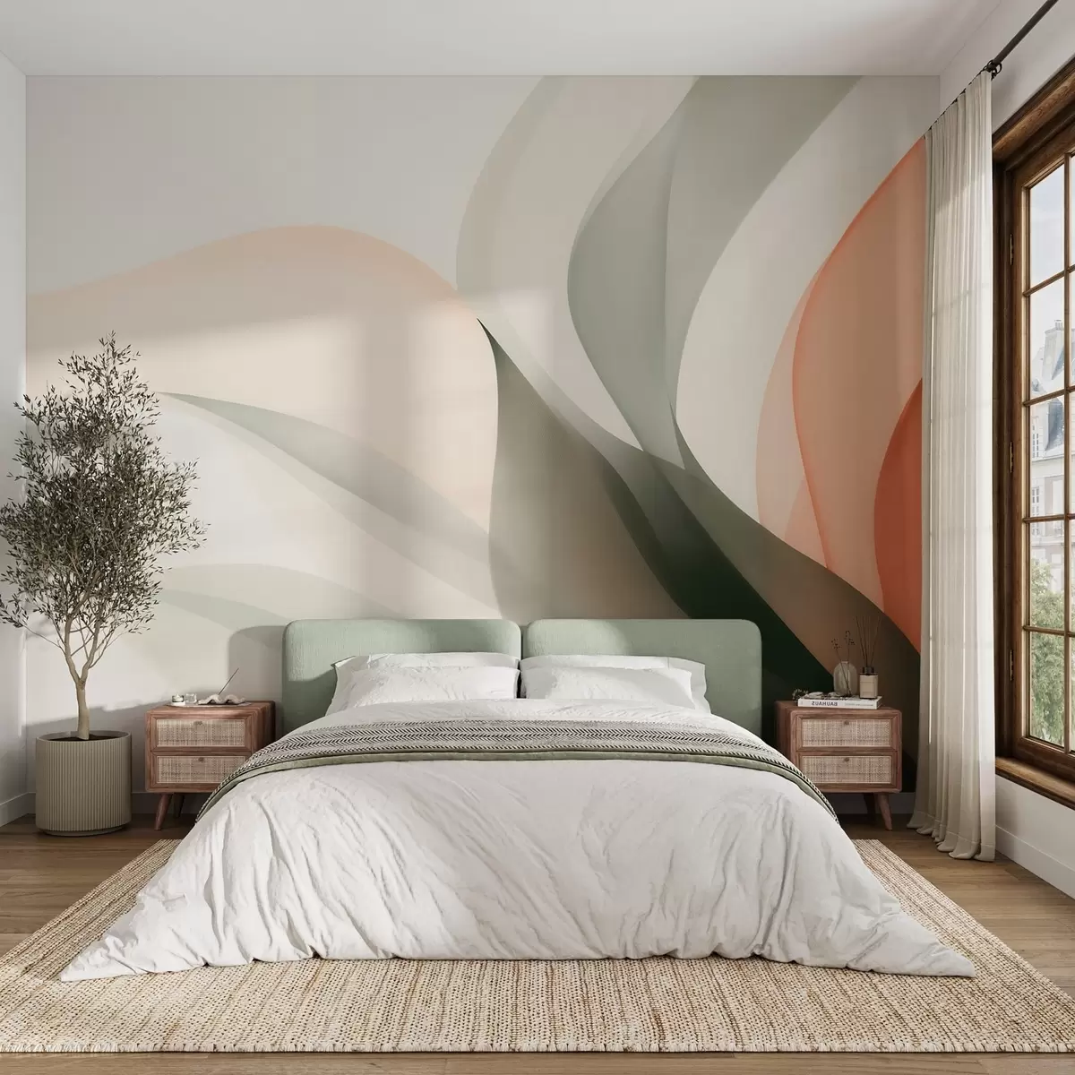 Abstract pastel waves in orange and green tones - Wall mural (No. w09718)