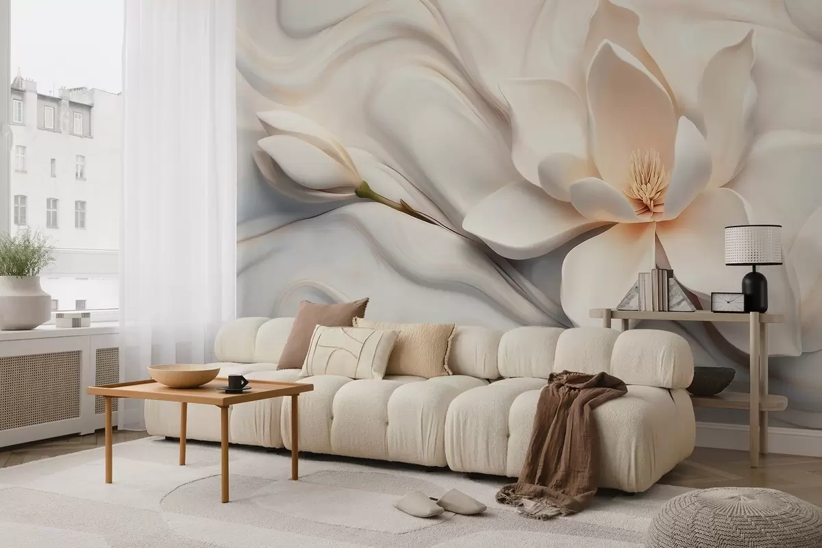 Three-dimensional white magnolia with marble texture imitation in relief - Wall mural (No. w09729)