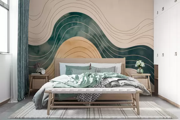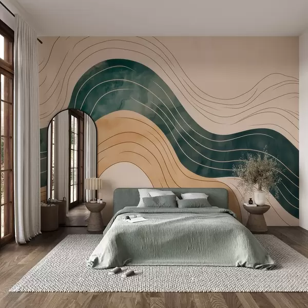 Abstract wavy lines in natural sand and emerald tones - Wall mural (No. w09732)