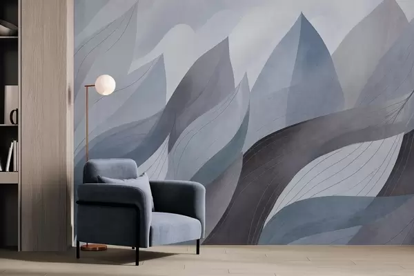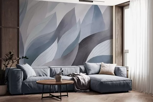 Abstract leaves, muted earth tones of blue with delicate line details , soft watercolor texture - Wall mural (No. w09736v1)