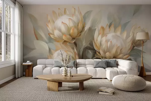 Textured protea flowers with green leaves and a soft, blurred background - Wall mural (No. w09738)
