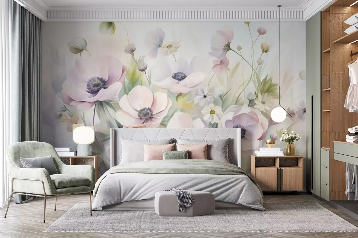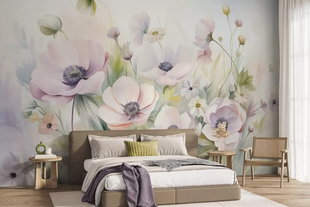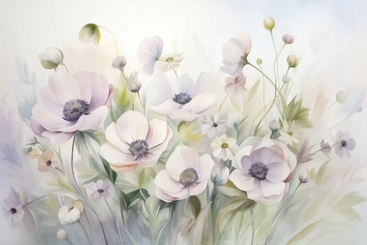 A field of pastel pink and white anemone flowers, green foliage and small white daisies - Wall mural (No. w09742)