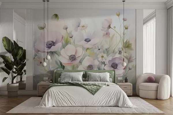 A field of pastel pink and white anemone flowers, green foliage and small white daisies - Wall mural (No. w09742)