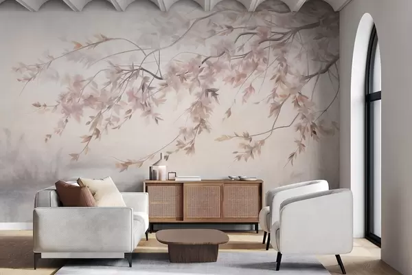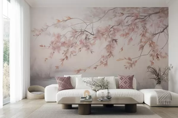 Textured landscape with cherry blossom branch, pink leaves, soft, foggy background - Wall mural (No. w09743)