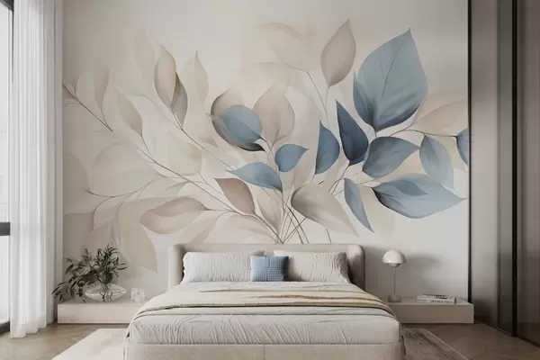 Abstract translucent leaves in shades of blue, beige and cream, textured art - Wall mural (No. w09744)