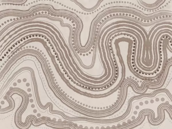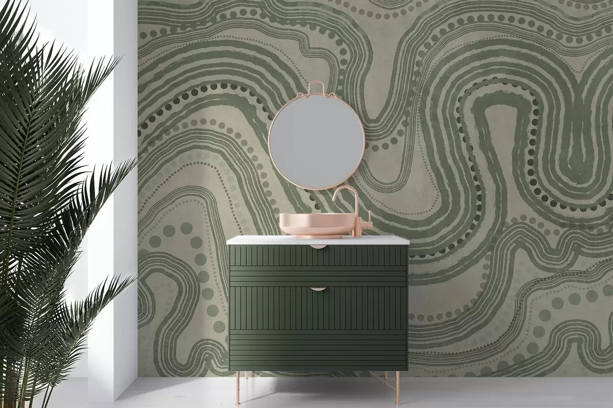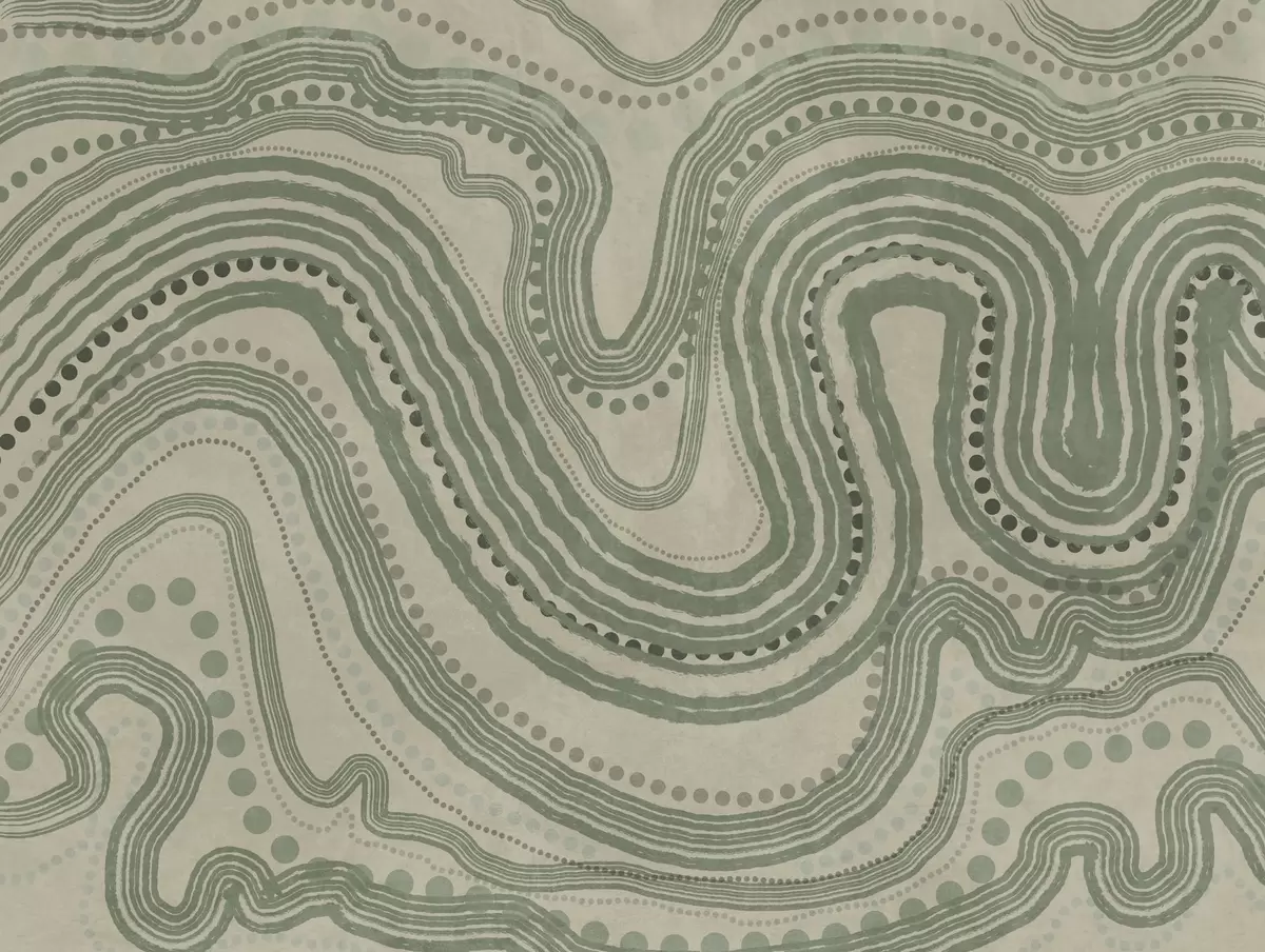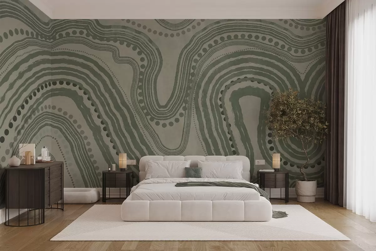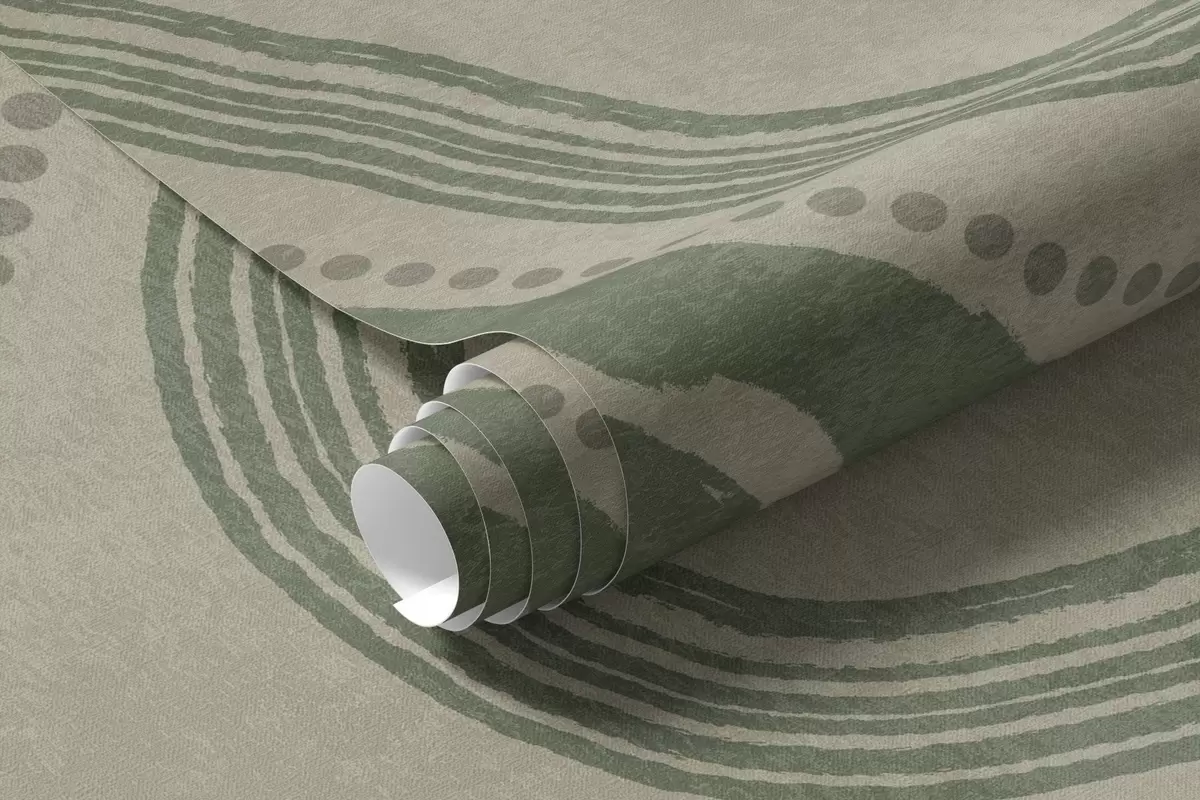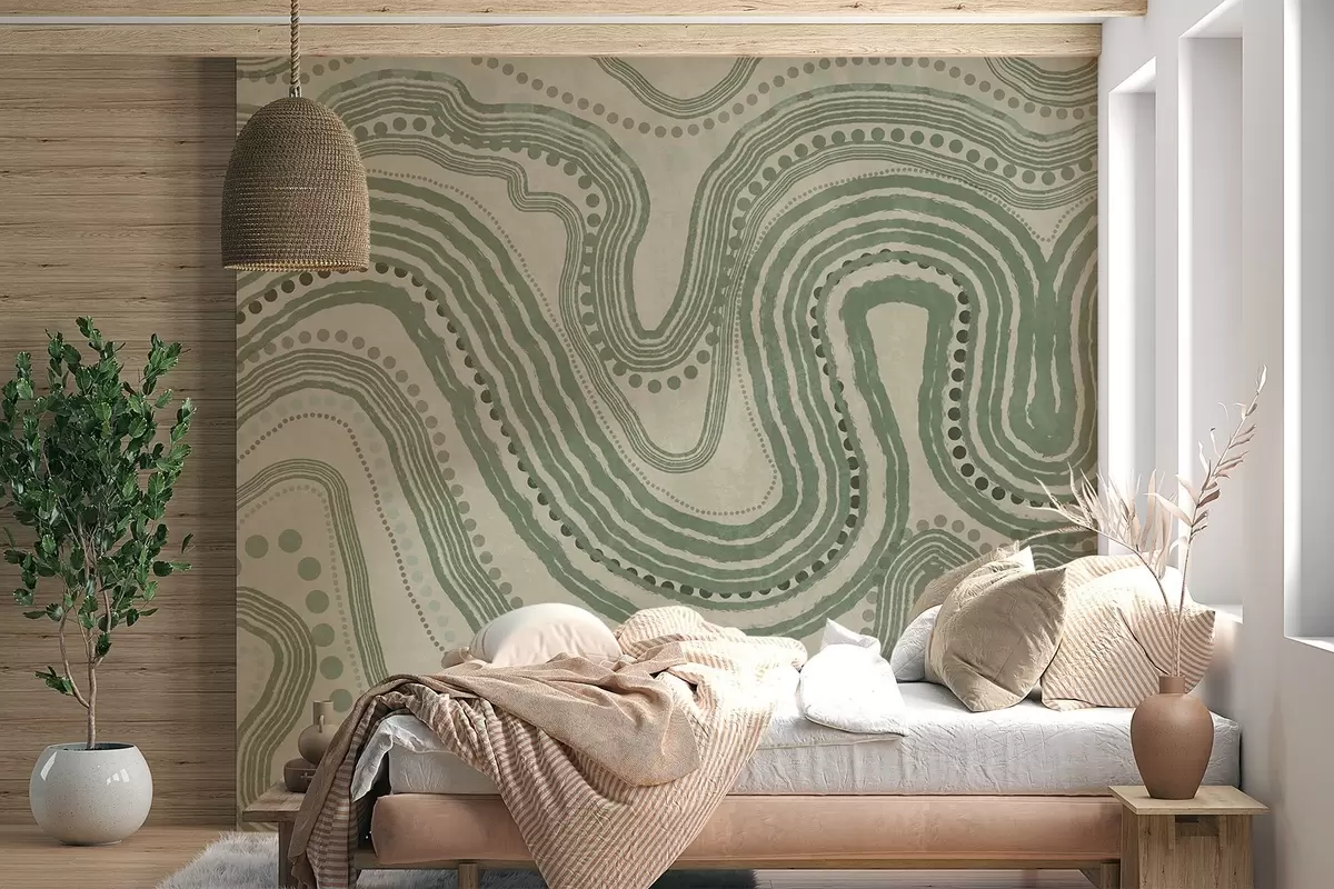 Abstract green and beige wavy lines and dots, modern textured art - Wall mural (No. w09747)