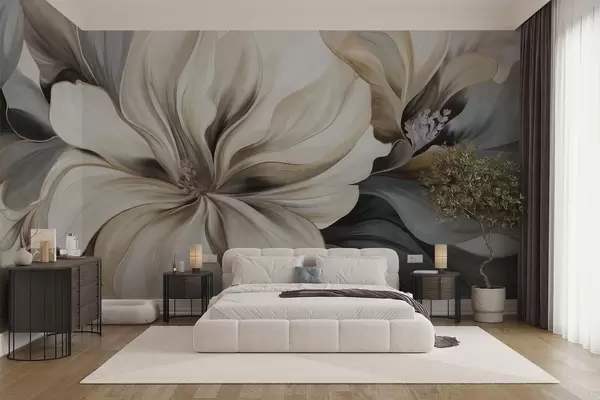 Large, creamy magnolia flowers with brown and grey leaves, soft lighting, abstract background - Wall mural (No. w09749)