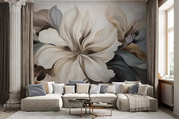 Large, creamy magnolia flowers with brown and grey leaves, soft lighting, abstract background - Wall mural (No. w09749)