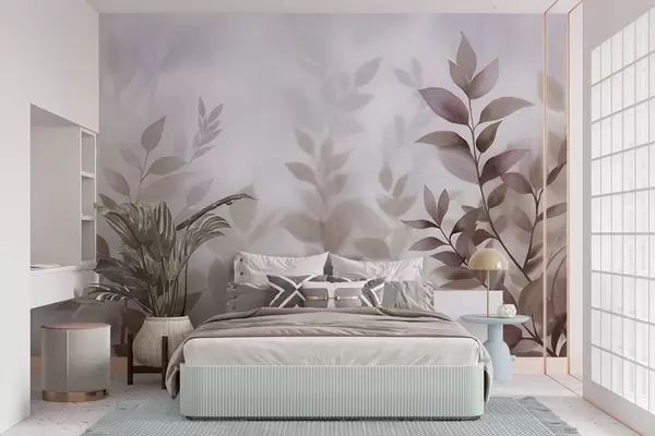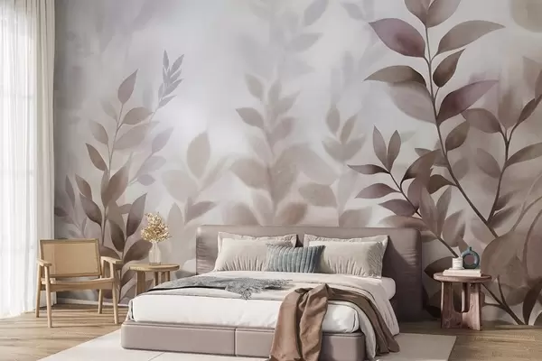 Delicate branches with muted brown and beige leaves, watercolor painting style, textured art - Wall mural (No. w09750)