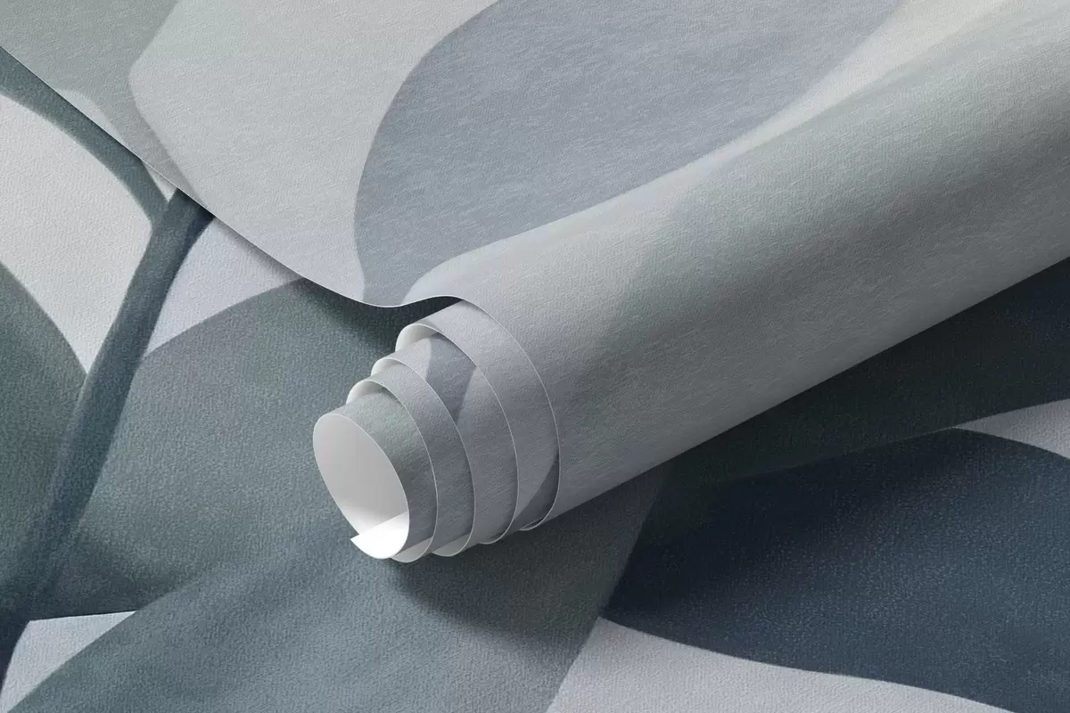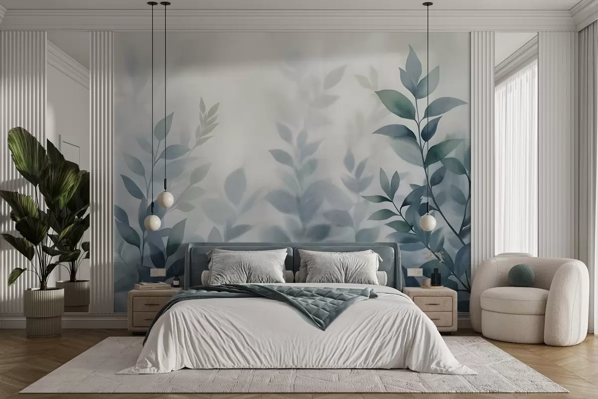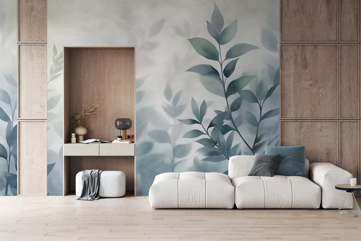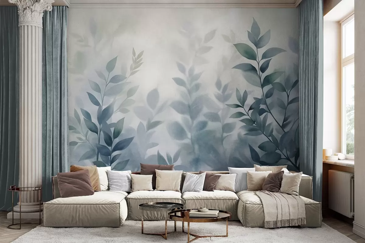 Delicate branches with muted blue leaves, watercolor painting style, textured art - Wall mural (No. w09750v1)