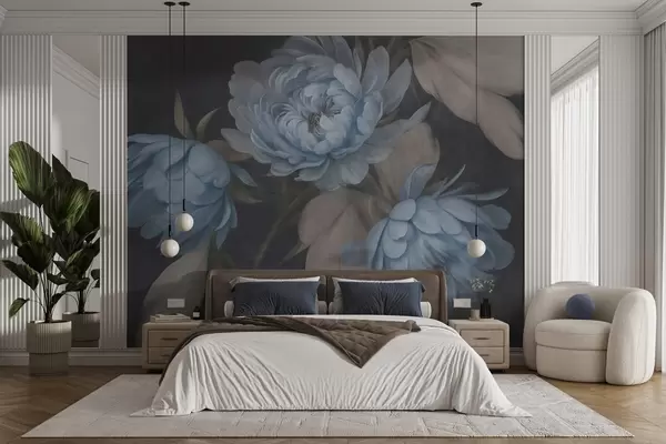 Textured light blue peony flowers with beige leaves against a dark background - Wall mural (No. w09751)