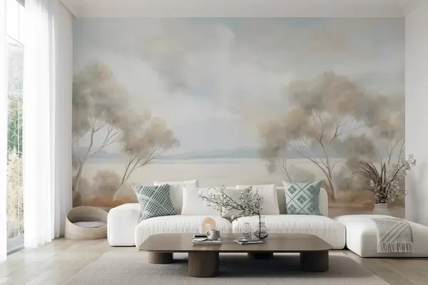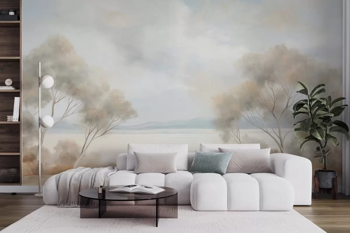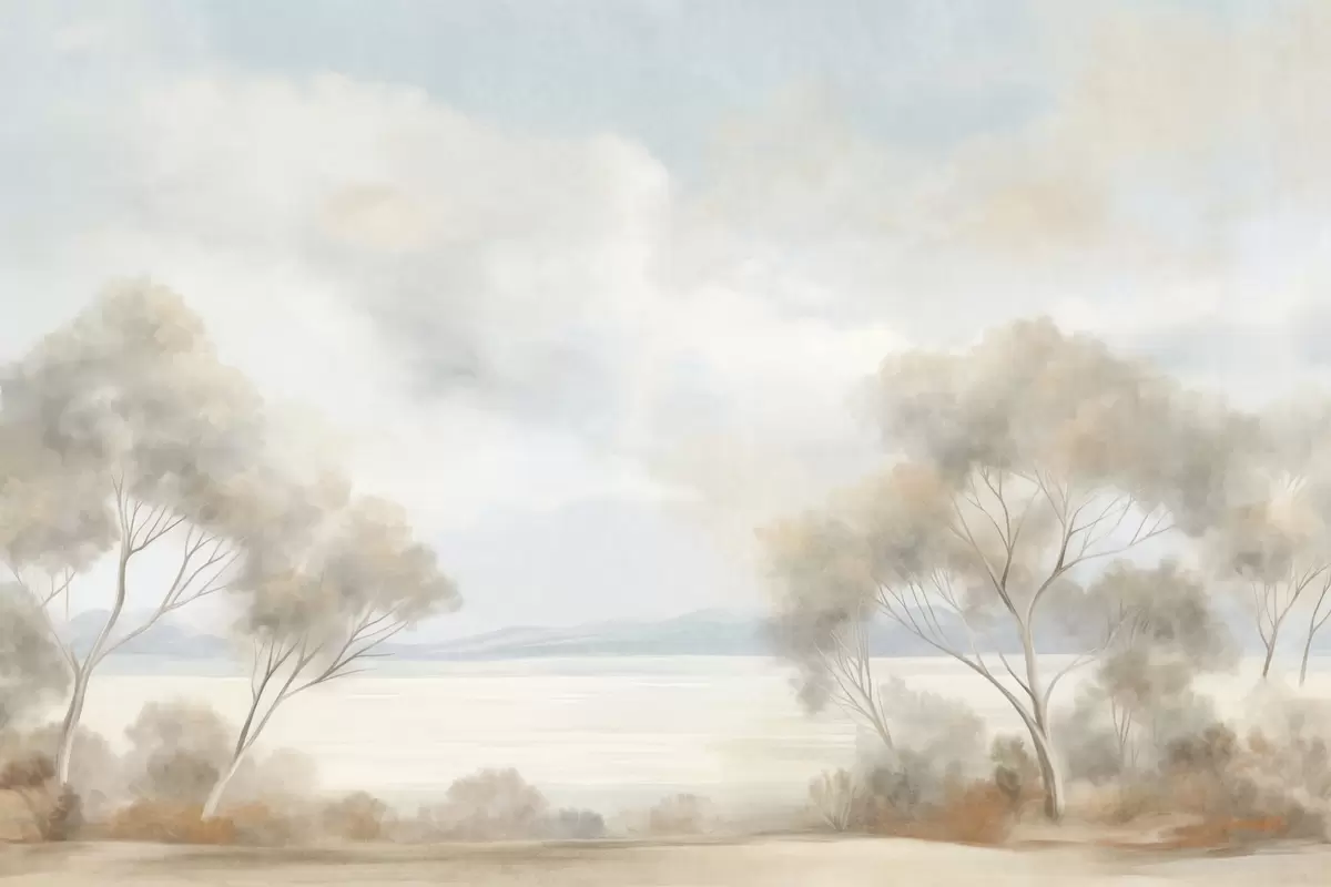 A landscape textured painting style with trees under a cloudy sky - Wall mural (No. w09753)
