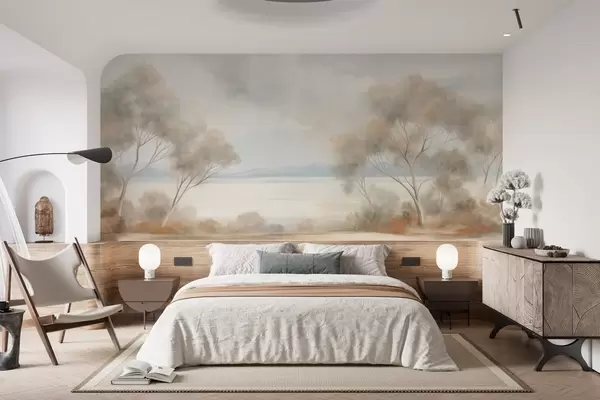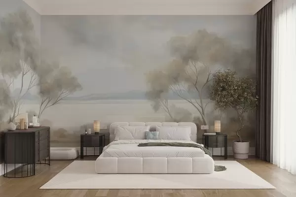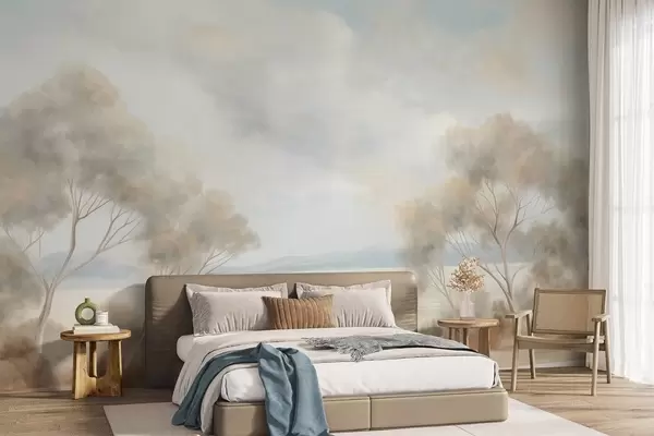 A landscape textured painting style with trees under a cloudy sky - Wall mural (No. w09753)
