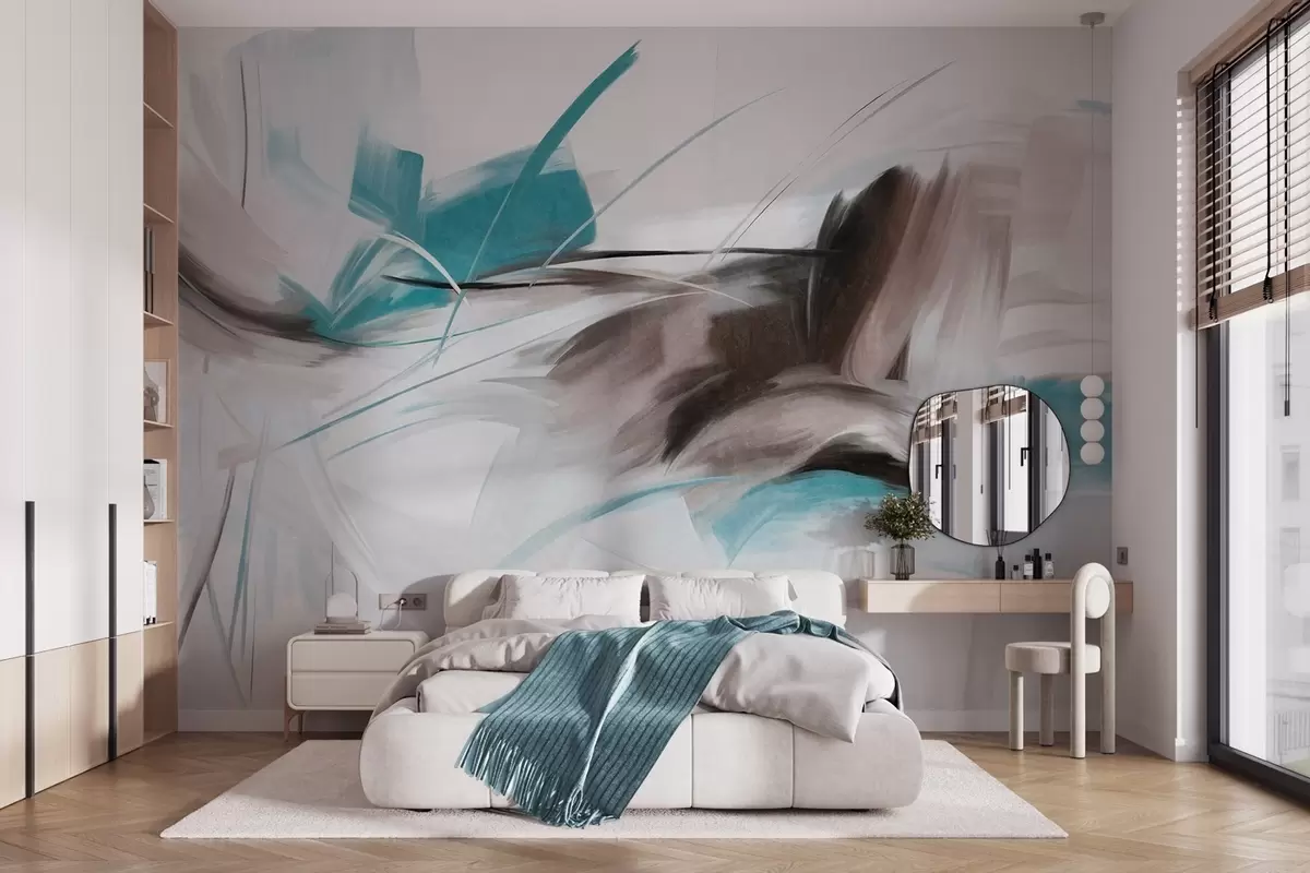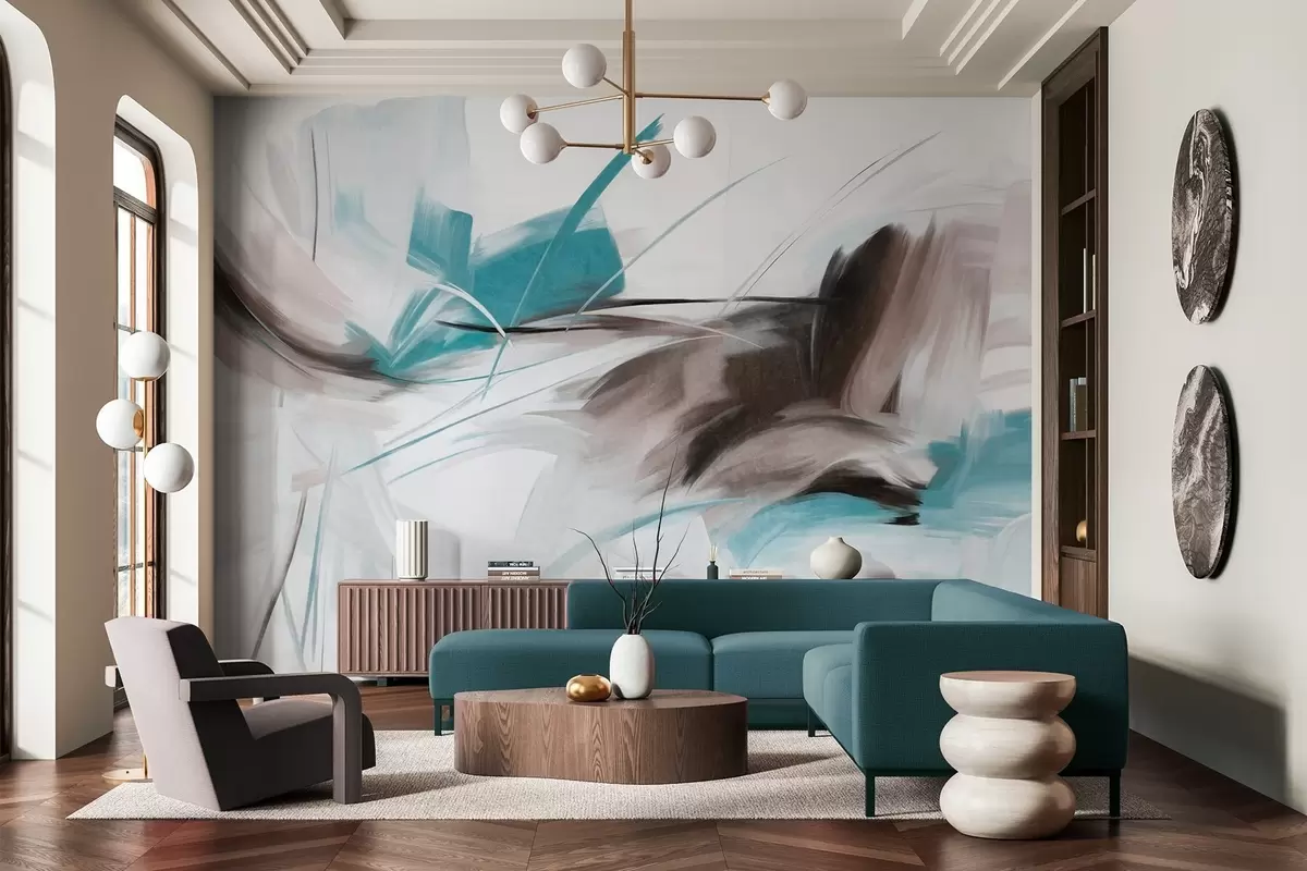 Abstract painting style with brown and blue textured brushstrokes - Wall mural (No. w09755v1)