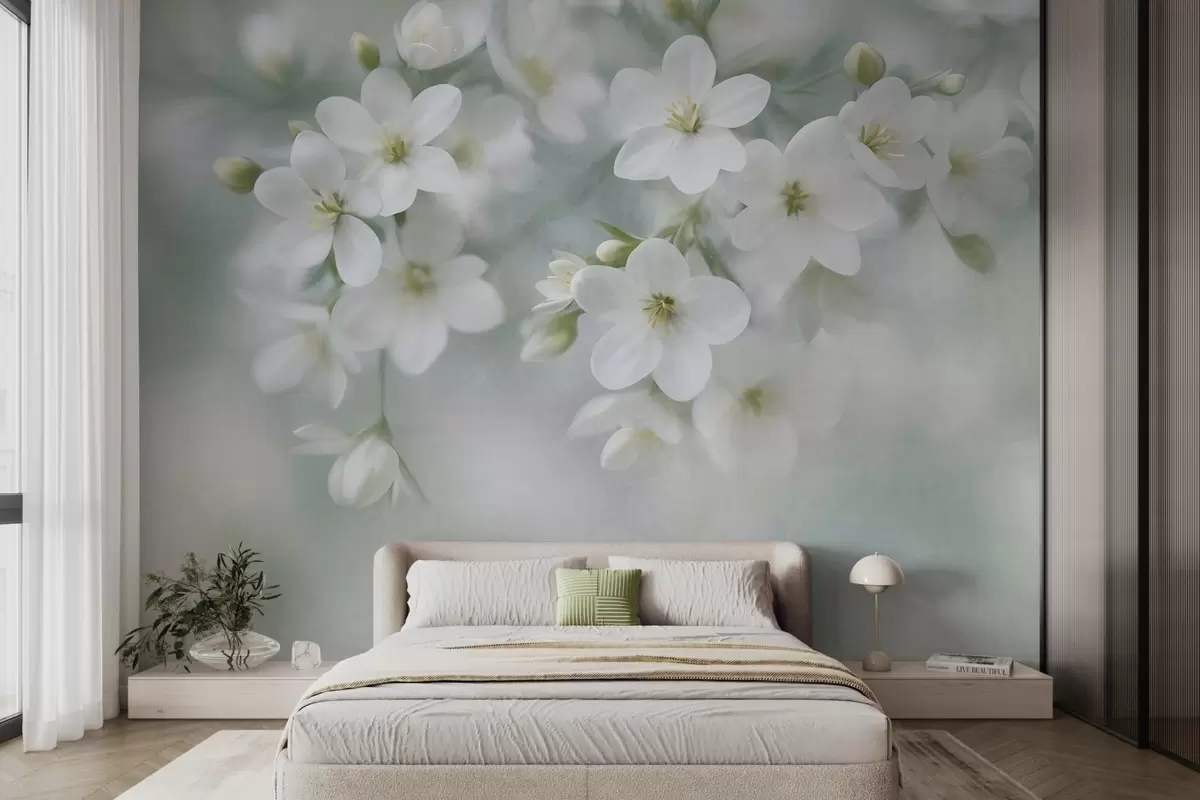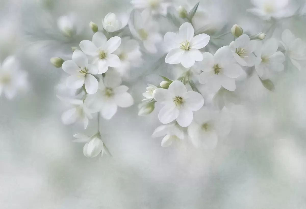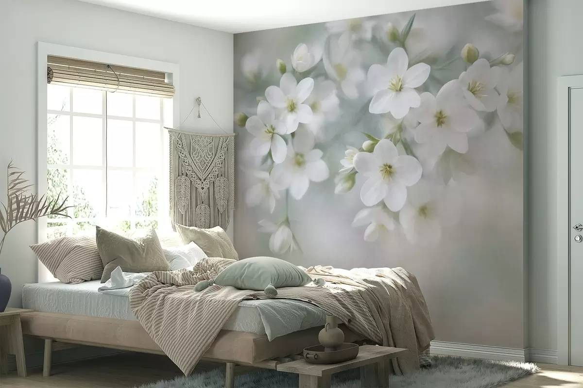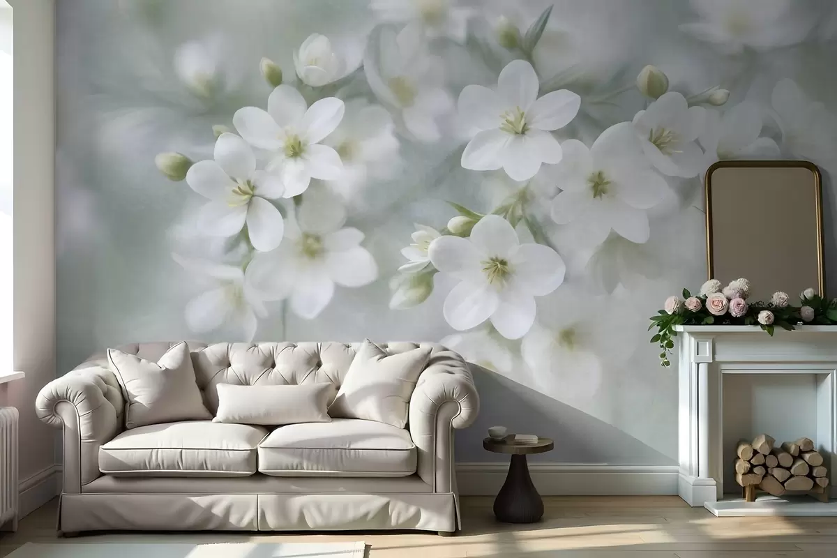 Delicate textured white flowers softly blurred in the background - Wall mural (No. w09759)