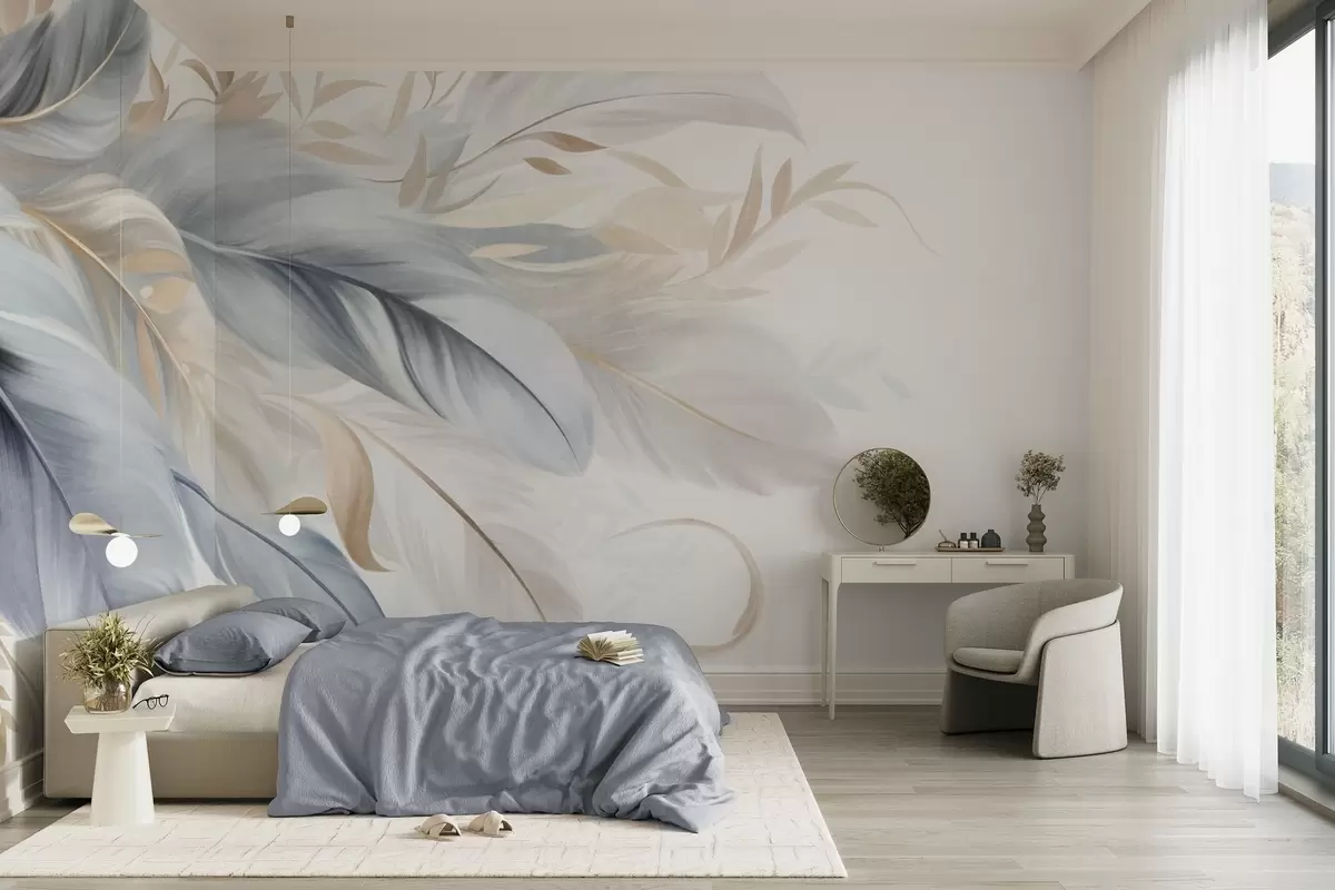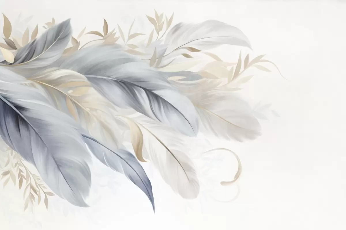 Textured pastel-colored feathers and delicate leaves against a light background - Wall mural (No. w09763)
