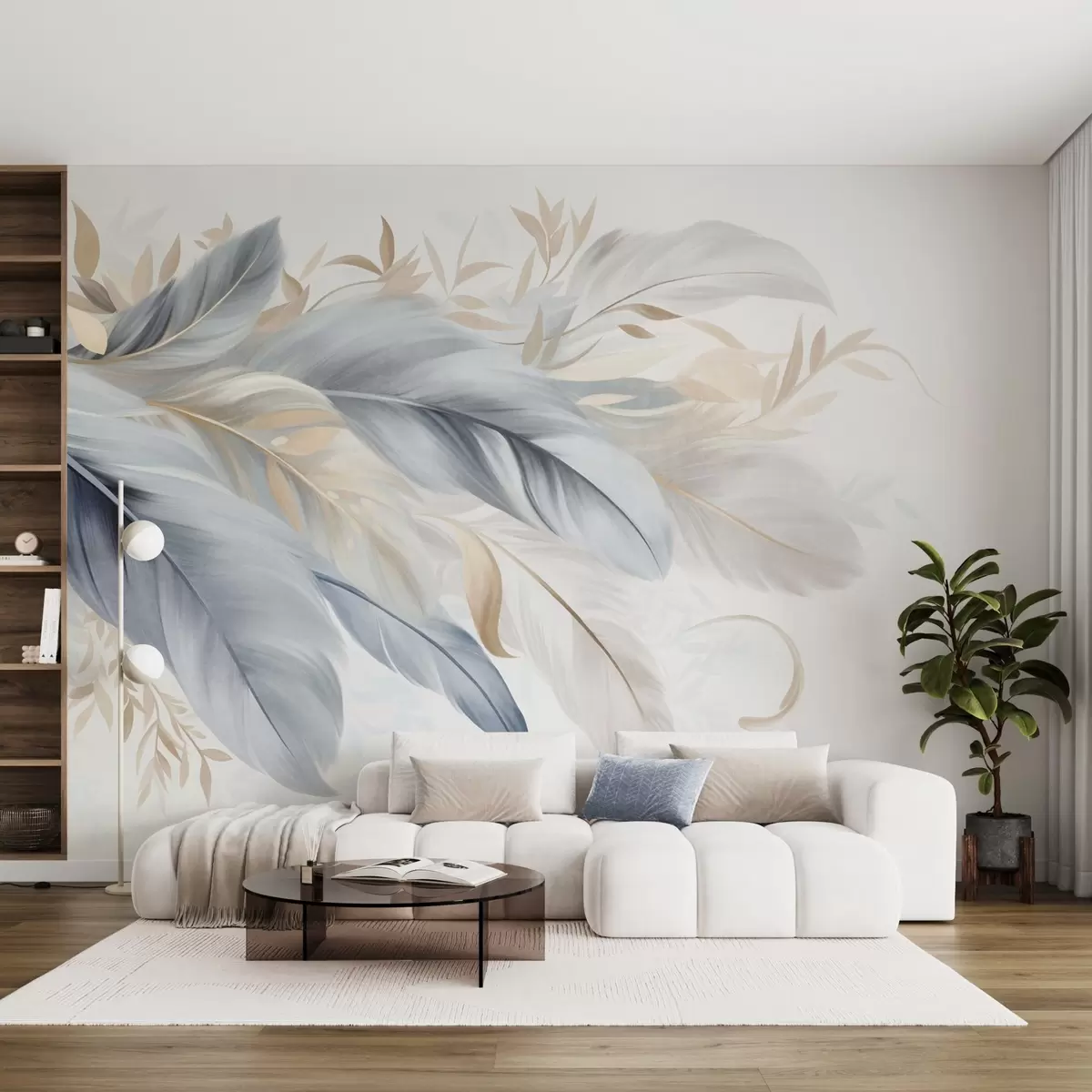 Textured pastel-colored feathers and delicate leaves against a light background - Wall mural (No. w09763)