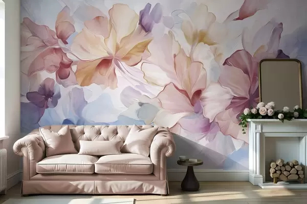 Abstract fantasy flowers in shades of pink, peach and lavender in painting style, textured art - Wall mural (No. w09767)