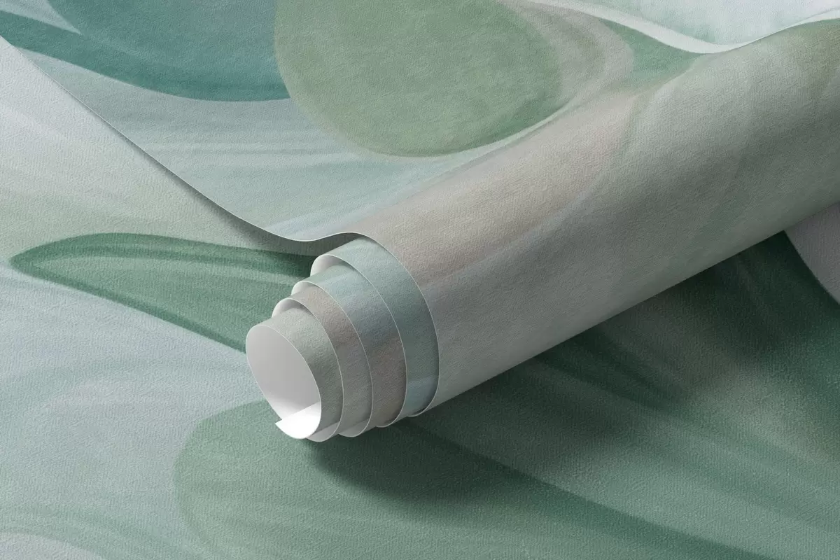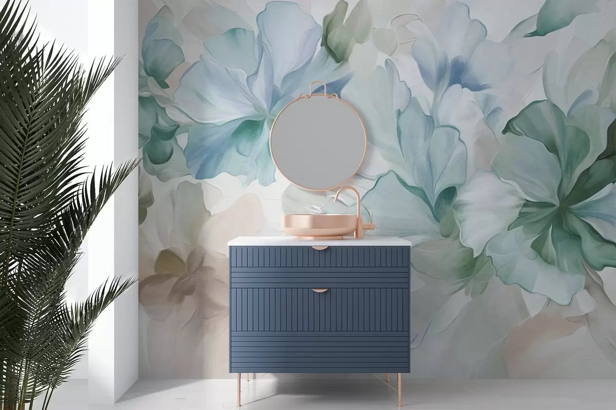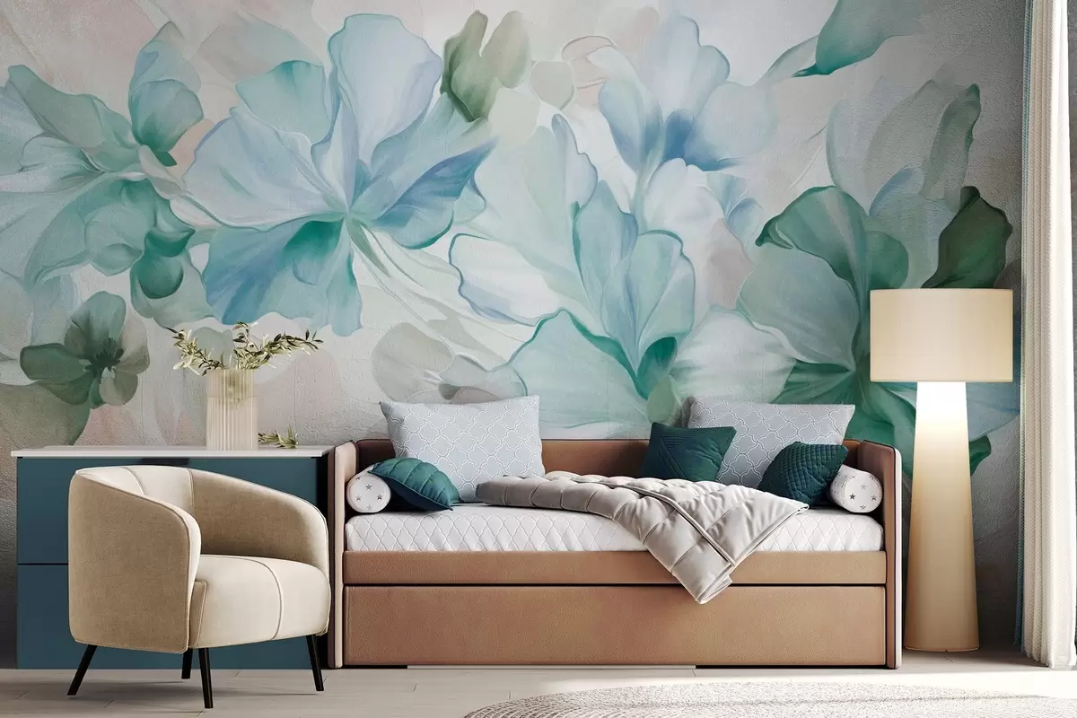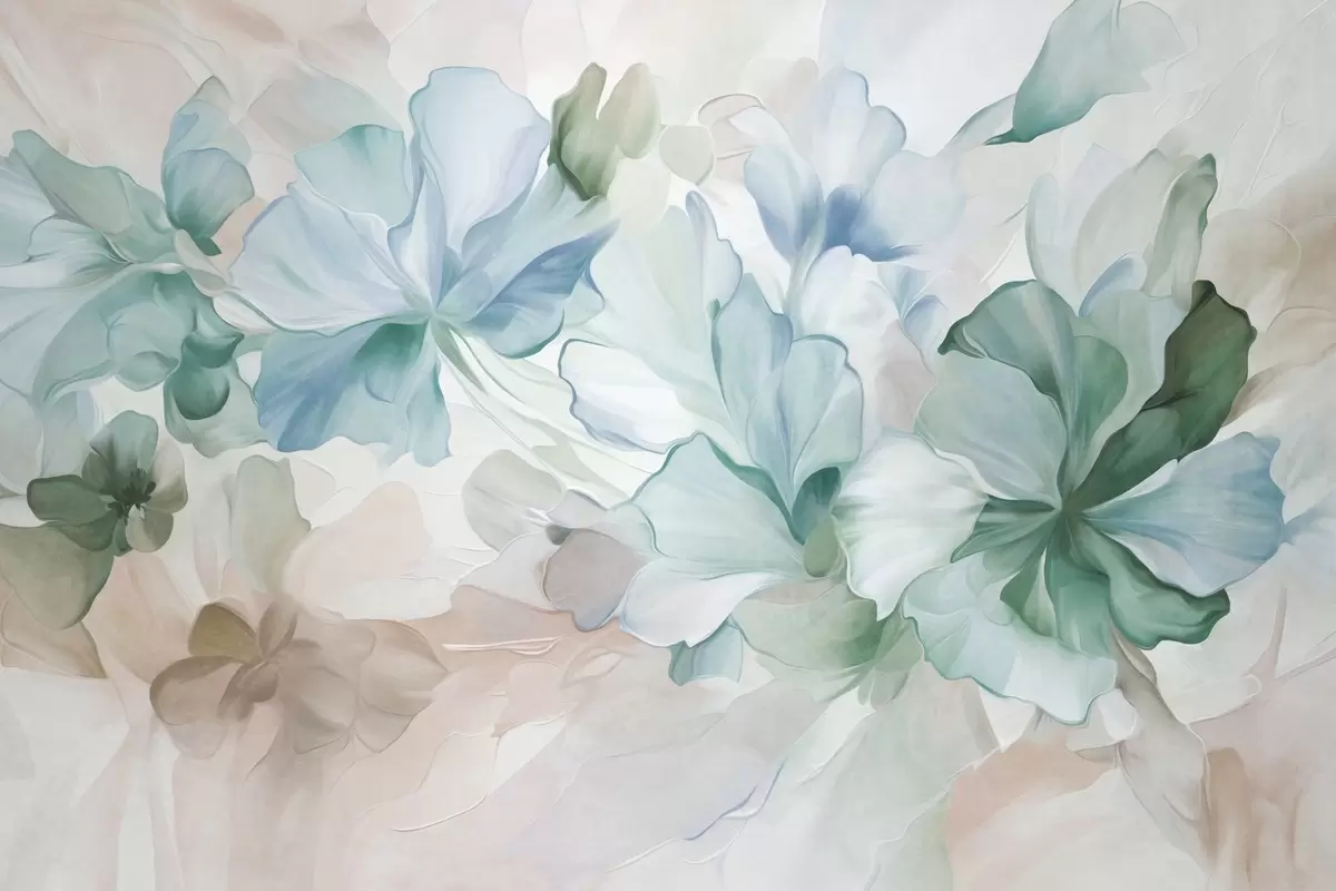 Abstract fantasy flowers in shades of green, blue and beige in painting style, textured art - Wall mural (No. w09767v1)