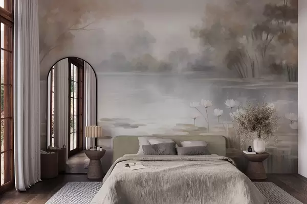 Textured landscape, lake with white water lilies, surrounded by trees in muted colors - Wall mural (No. w09768)