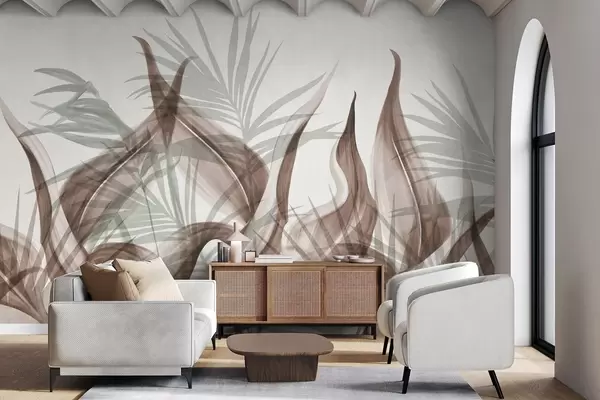 Tropical leaves in shades of brown and green against a white background, textured watercolor style - Wall mural (No. w09772)