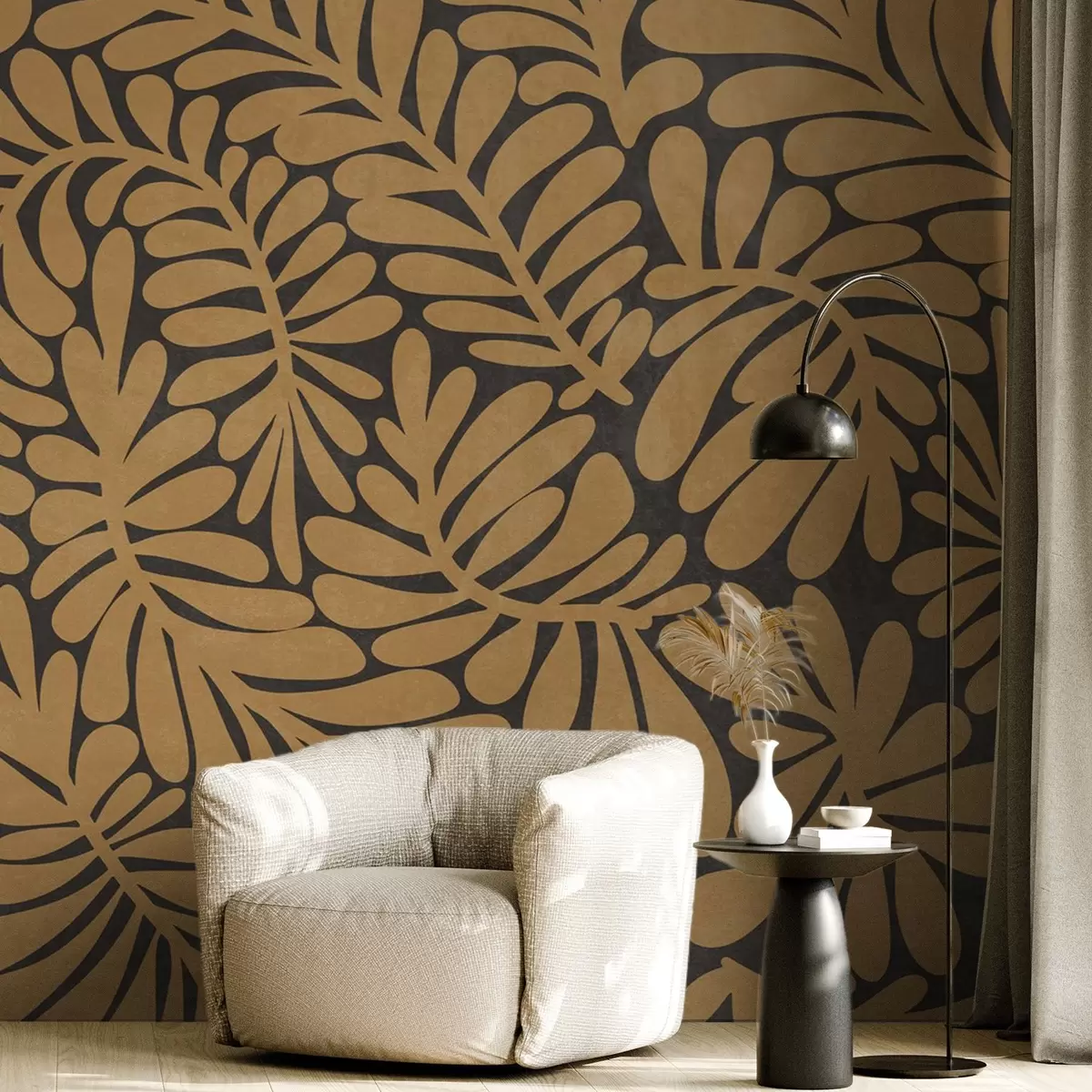Stylized mustard yellow leaves against a dark gray background, textured art - Wall mural (No. w09775)