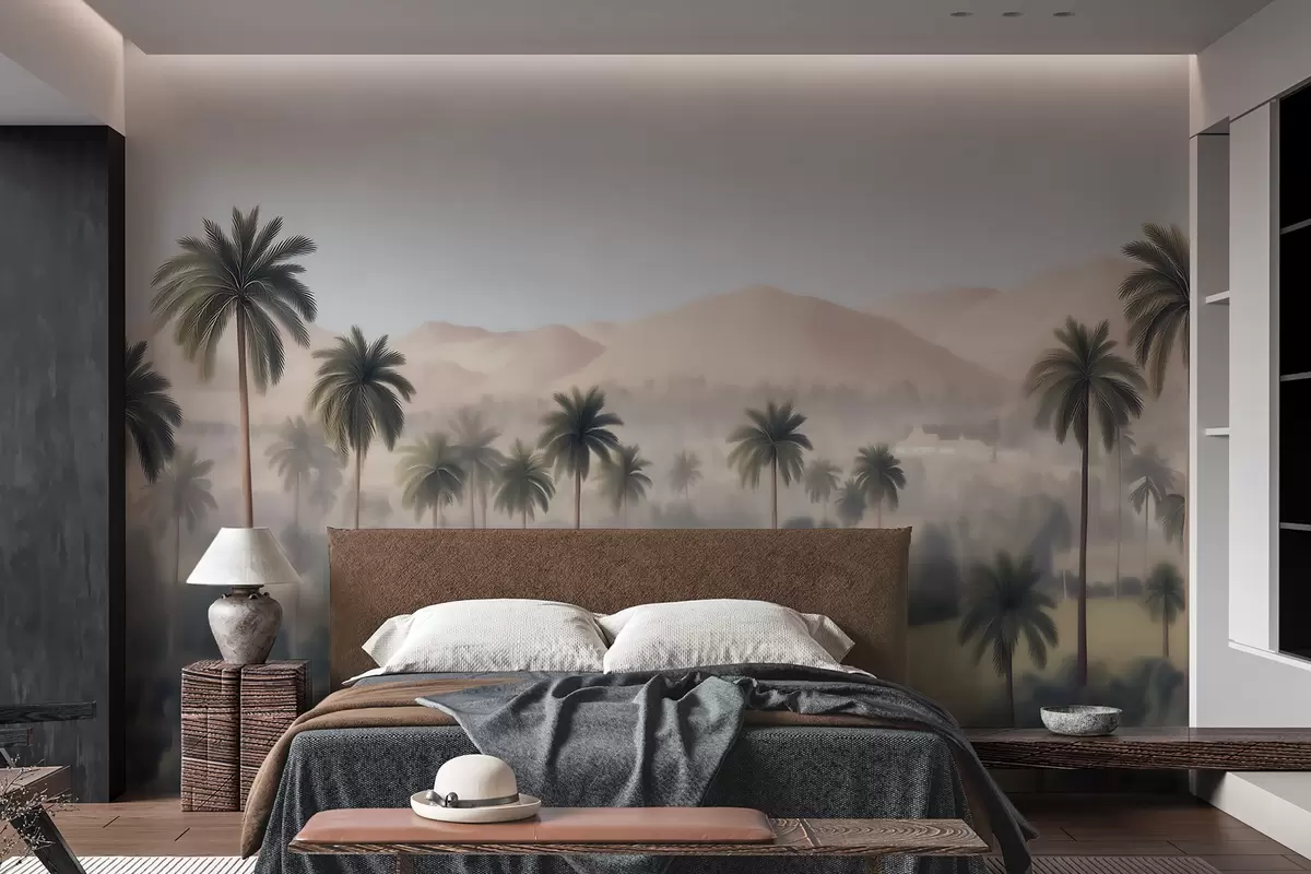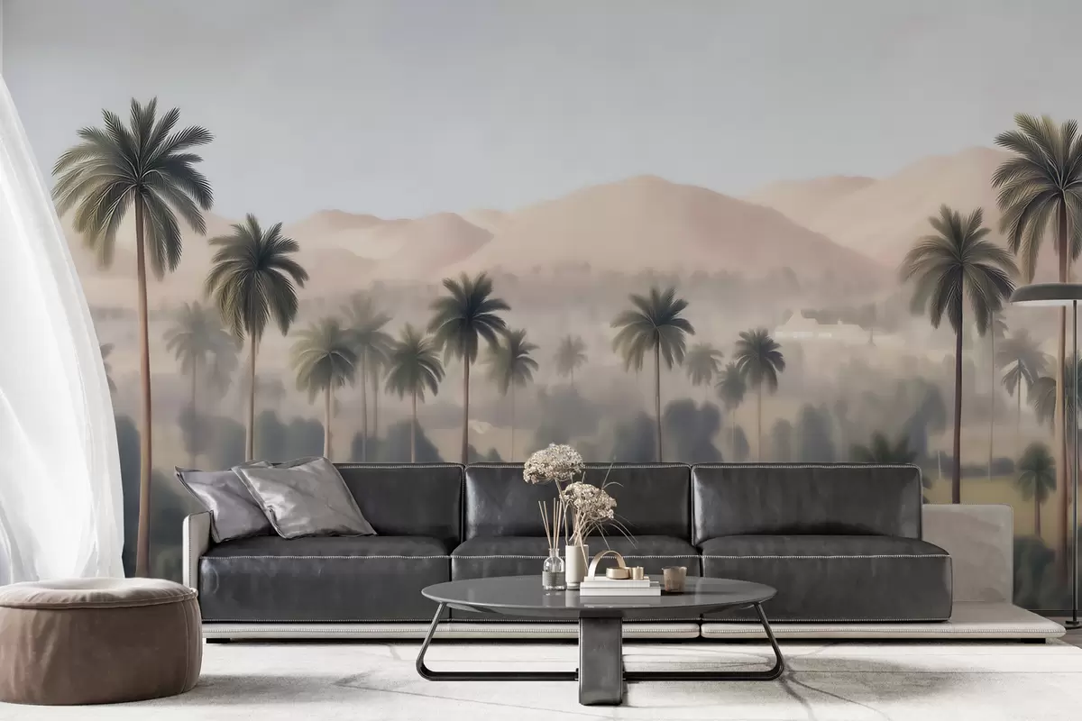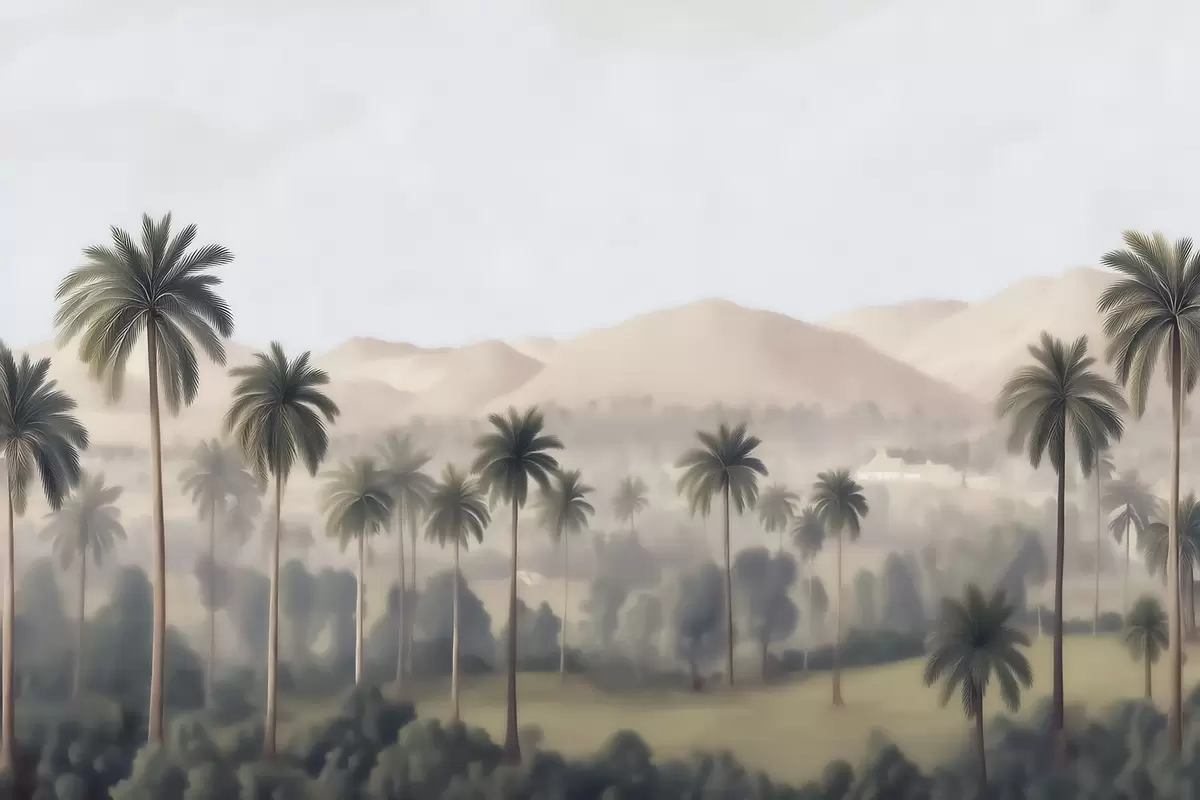 Tropical landscape with palm trees and mountains, vintage panorama in beige and green tones - Wall mural (No. w09798)