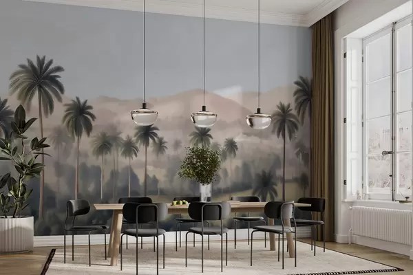 Tropical landscape with palm trees and mountains, vintage panorama in beige and green tones - Wall mural (No. w09798)