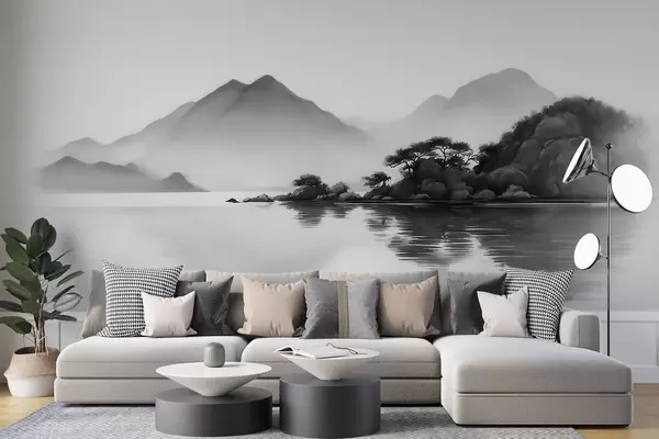 Black and white landscape with mountains and lake in soft mist - Wall mural (No. w09803)
