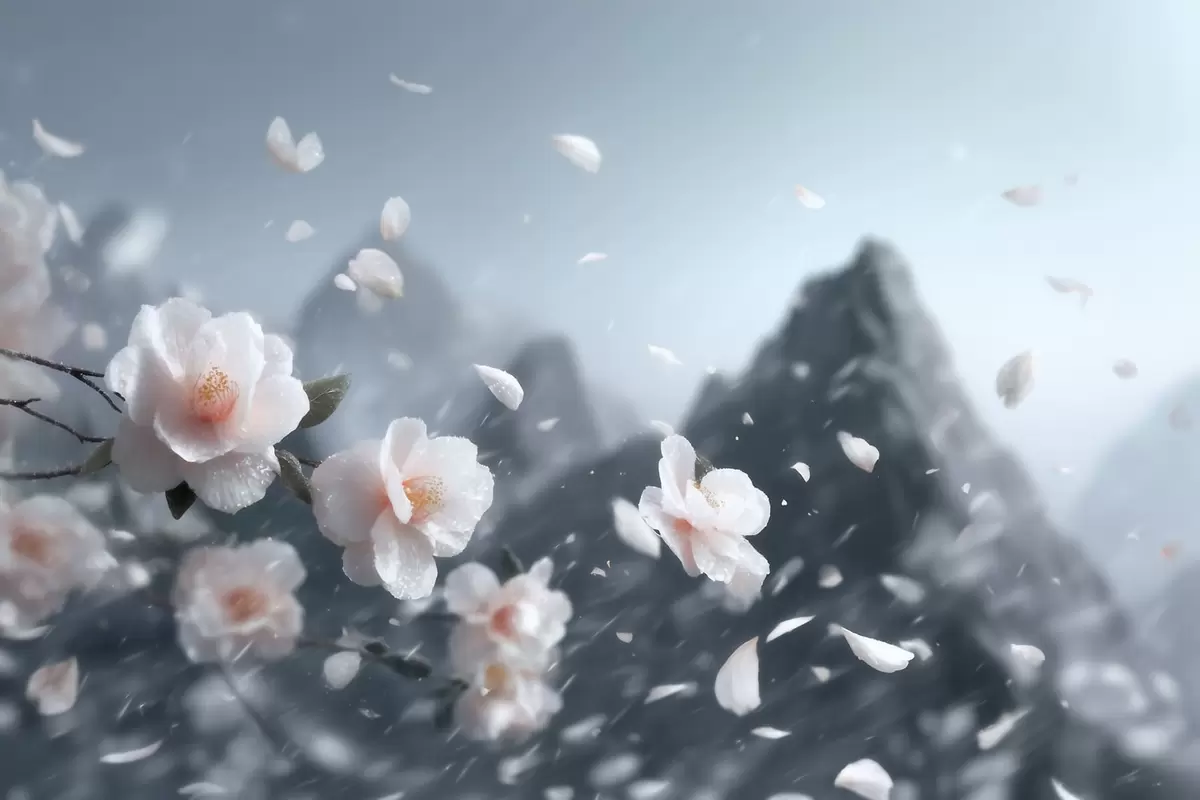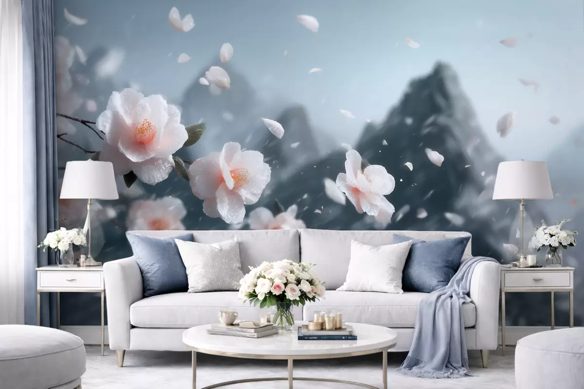 Delicate cherry blossom flowers against a mountain backdrop, atmospheric Japanese landscape in pastel tones - Wall mural (No. w09808)