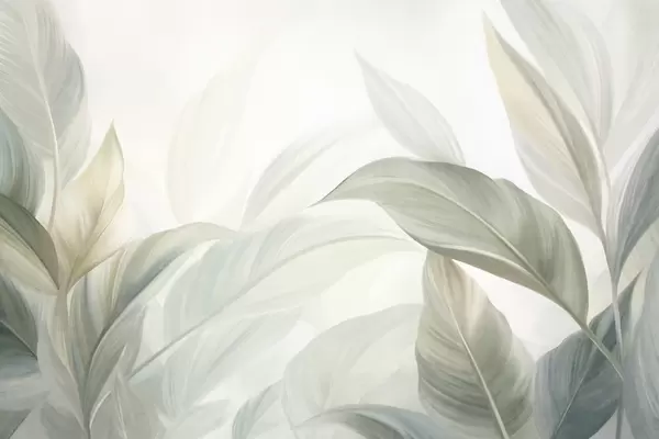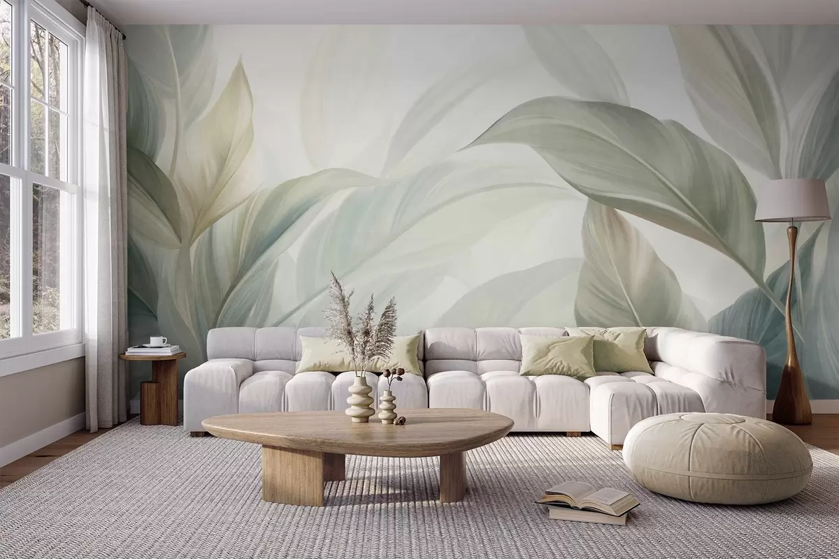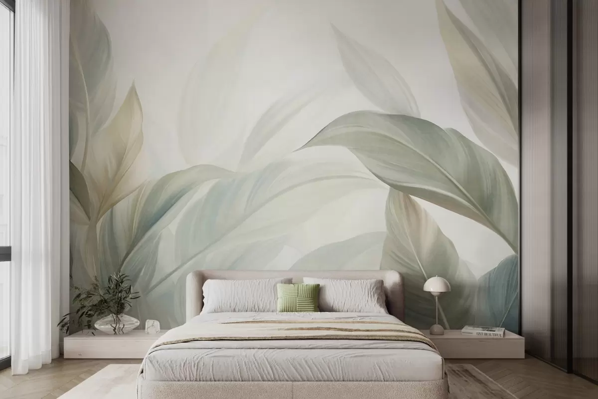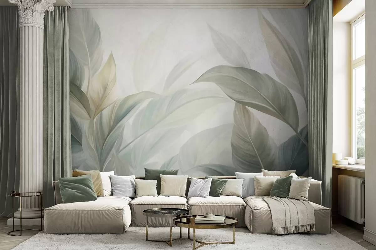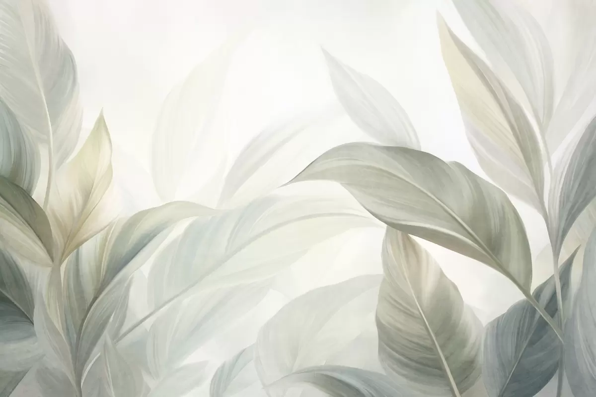 Large, pale green tropical leaves with soft, pastel colors, textured art - Wall mural (No. w09816)
