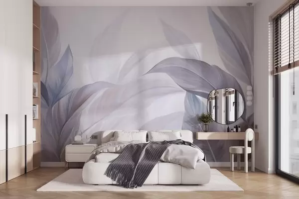 Large, pale blue and violet tropical leaves with soft, pastel colors, textured art - Wall mural (No. w09816v1)