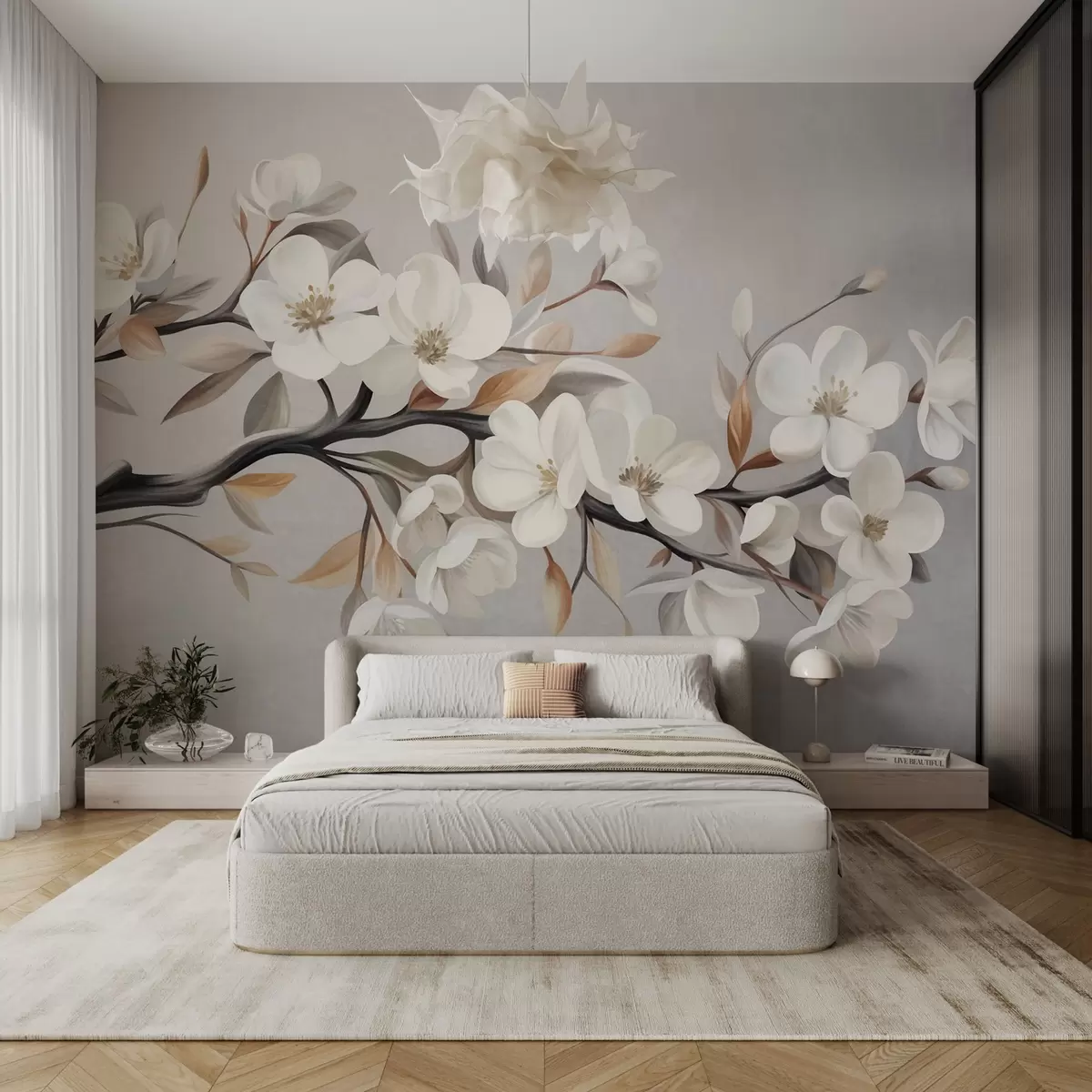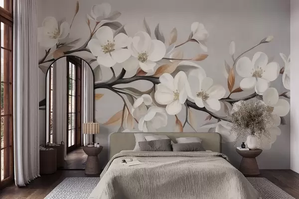 Textured branch with white flowers and brown leaves against a light gray background - Wall mural (No. w09817)