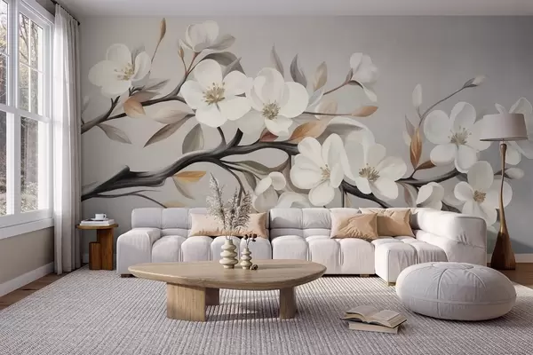 Textured branch with white flowers and brown leaves against a light gray background - Wall mural (No. w09817)