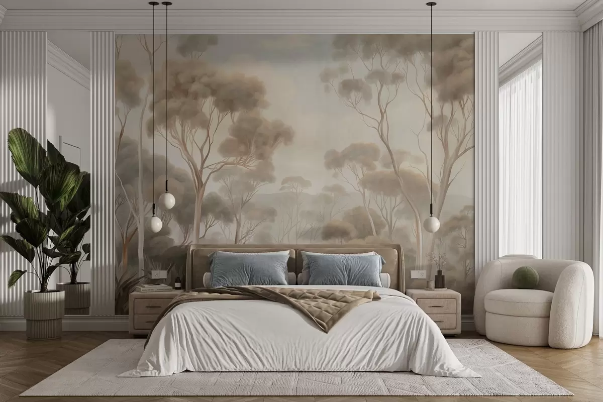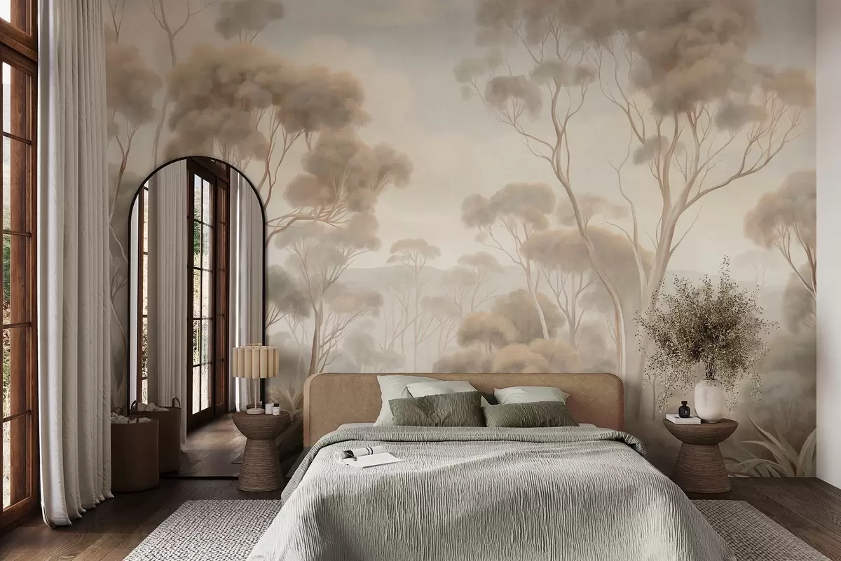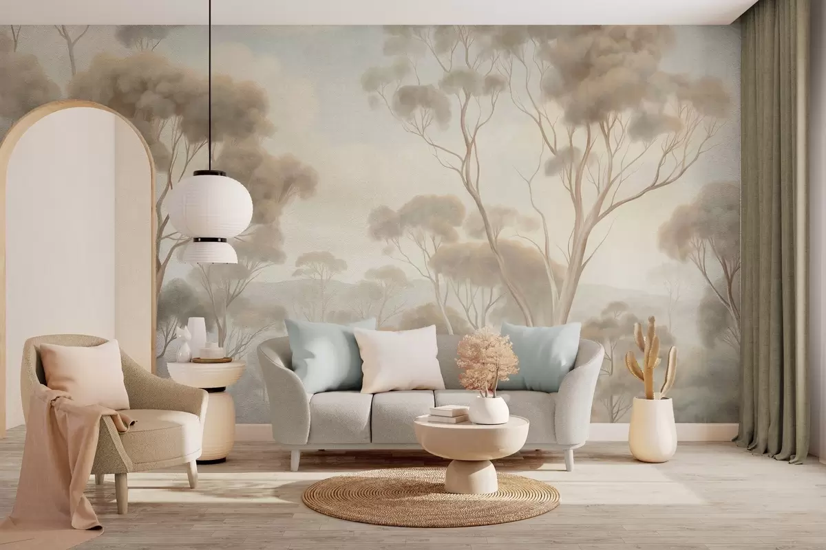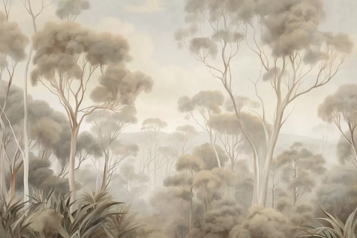 A misty forest landscape with tall eucalyptus trees, with rolling hills under a cloudy sky, textured art - Wall mural (No. w09822)