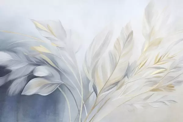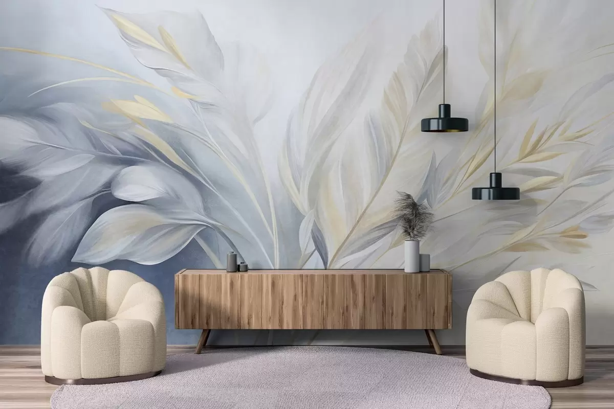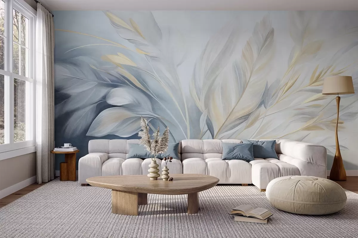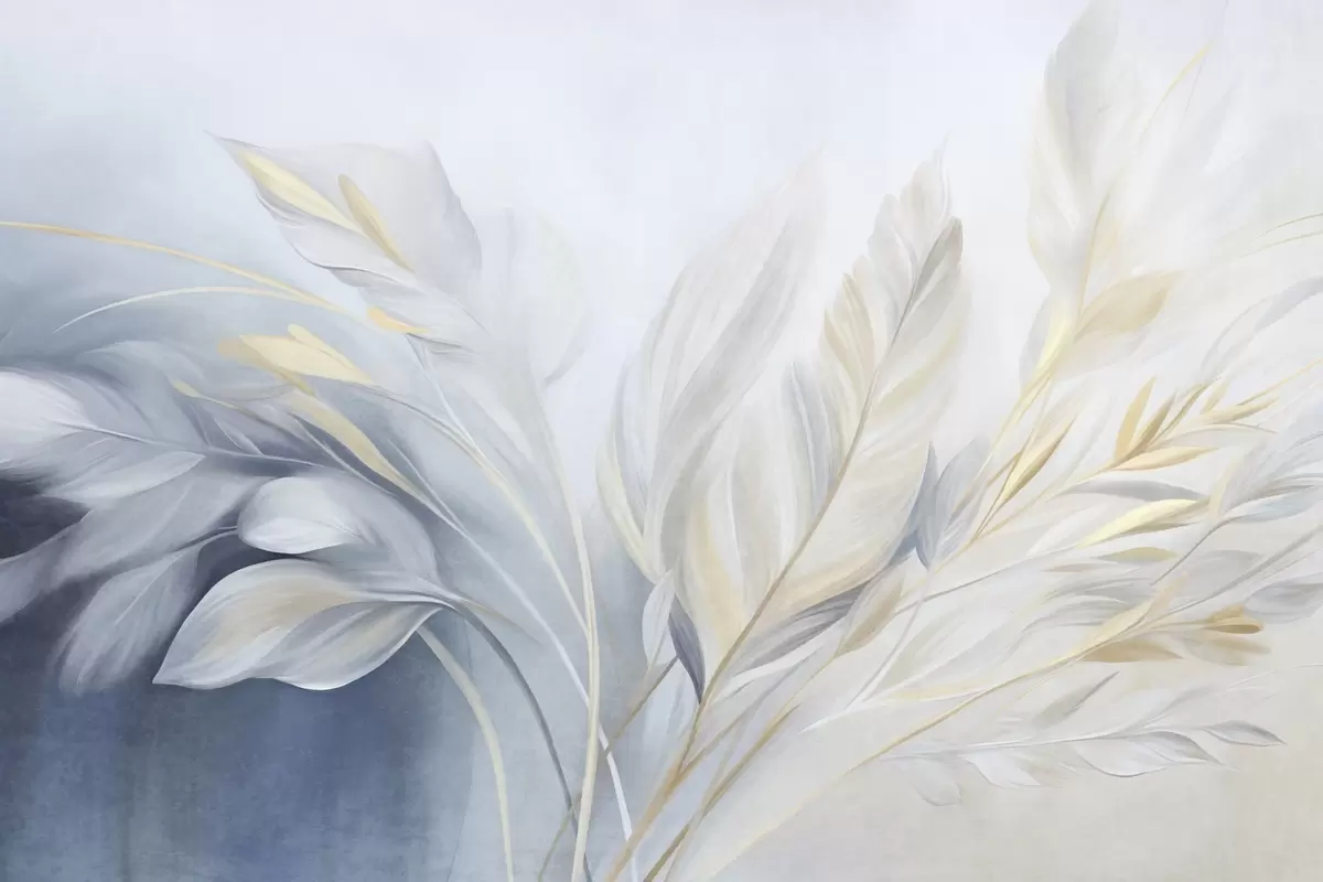 Textured feathers with yellow accents, against a soft background of pale blue and white - Wall mural (No. w09826)