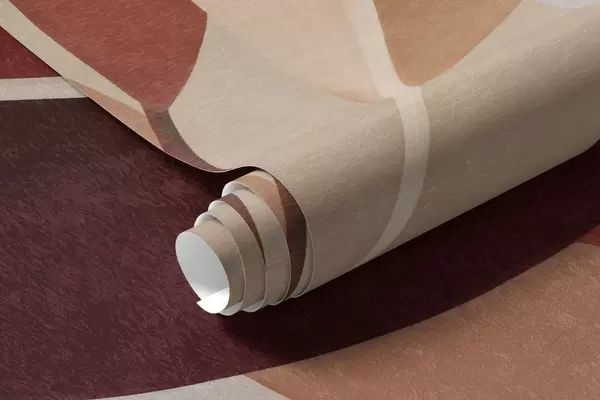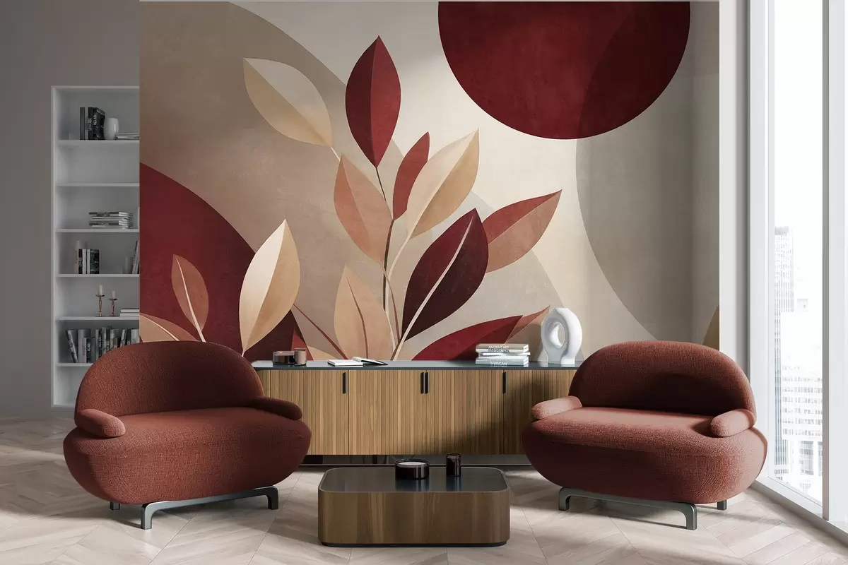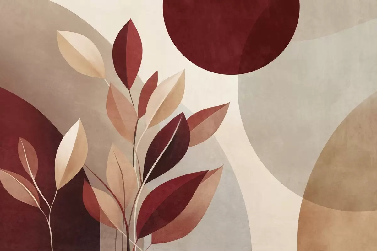 Textured bordo and beige leaves on a background of abstract shapes, minimalism, modern art - Wall mural (No. w09829)