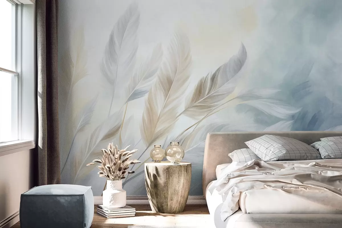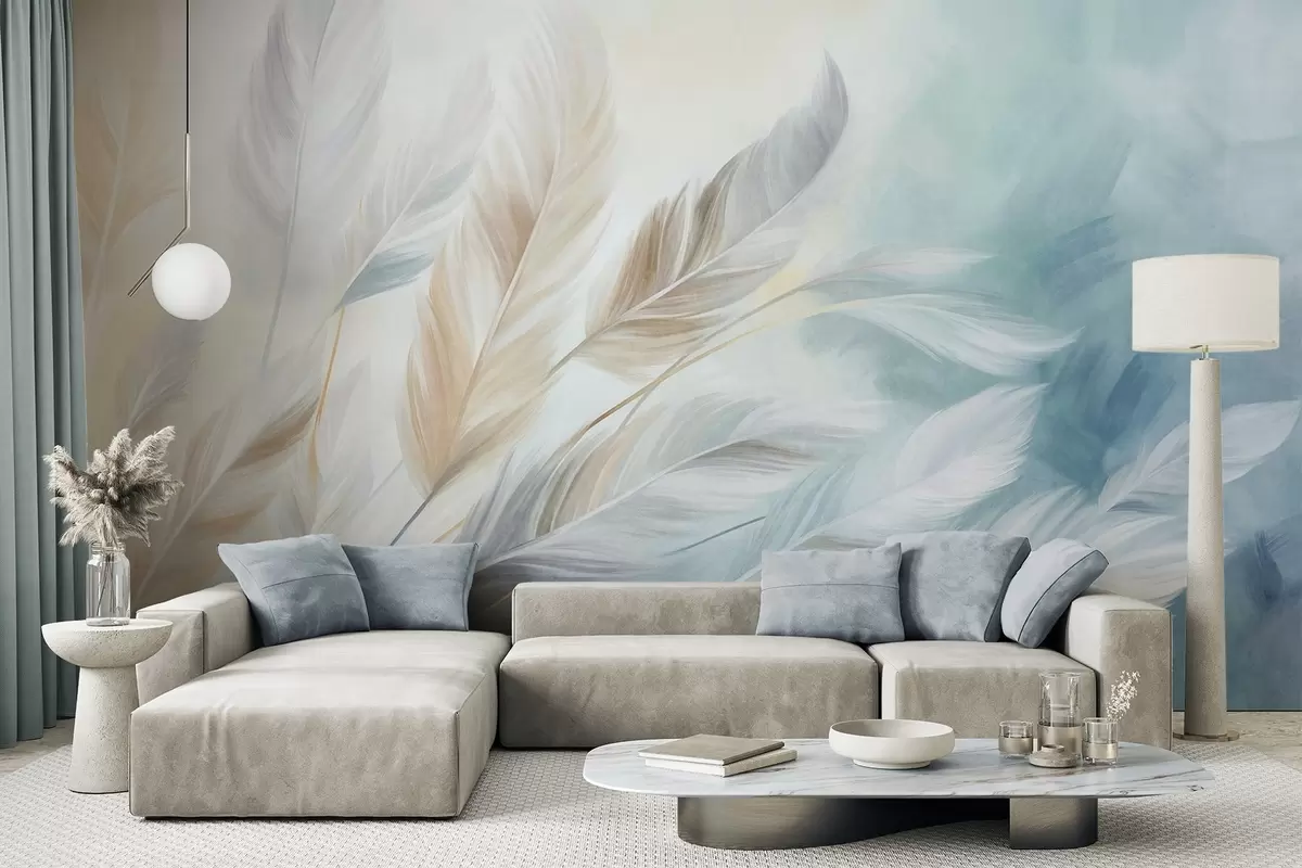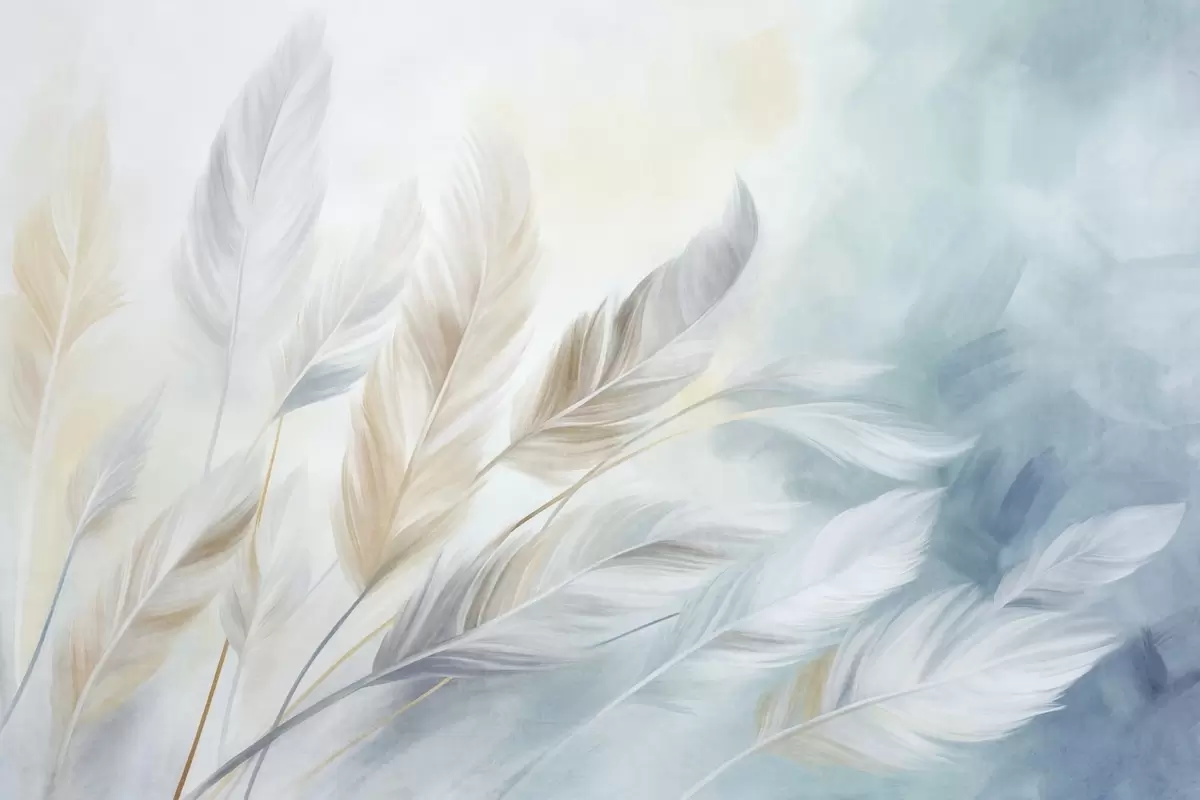 Textured pastel feathers with soft, wispy edges, against a background in watercolor style - Wall mural (No. w09833)
