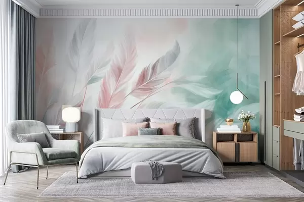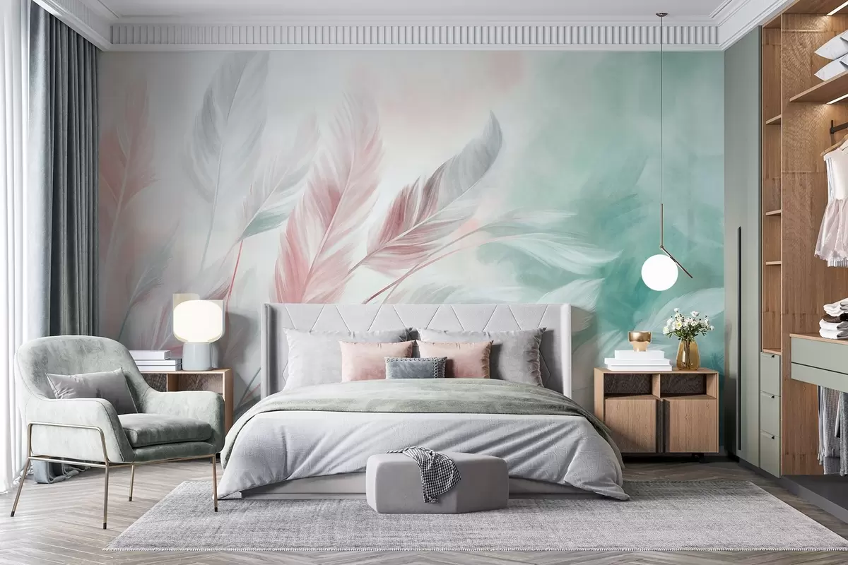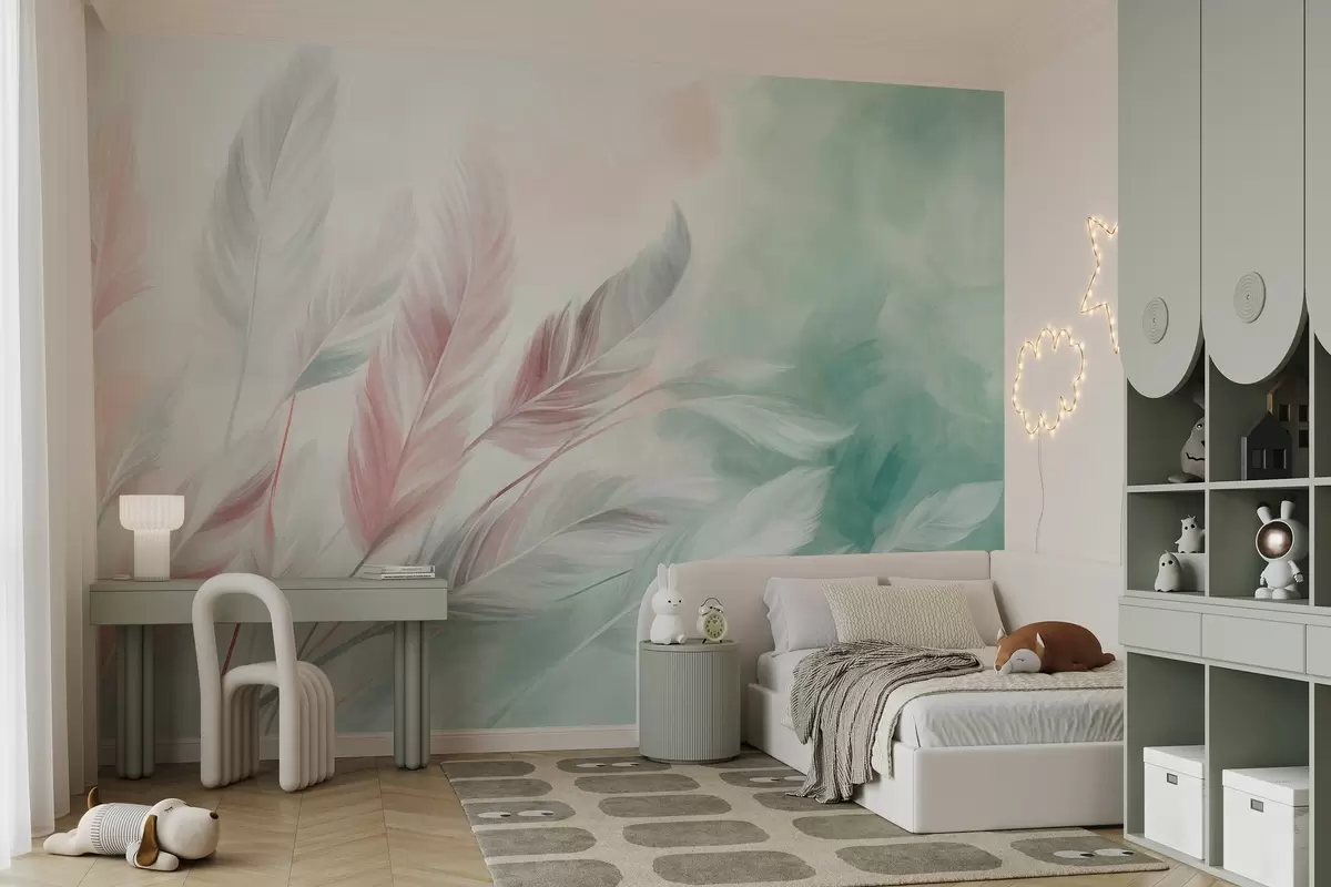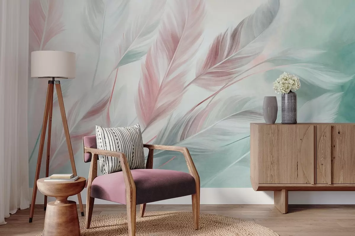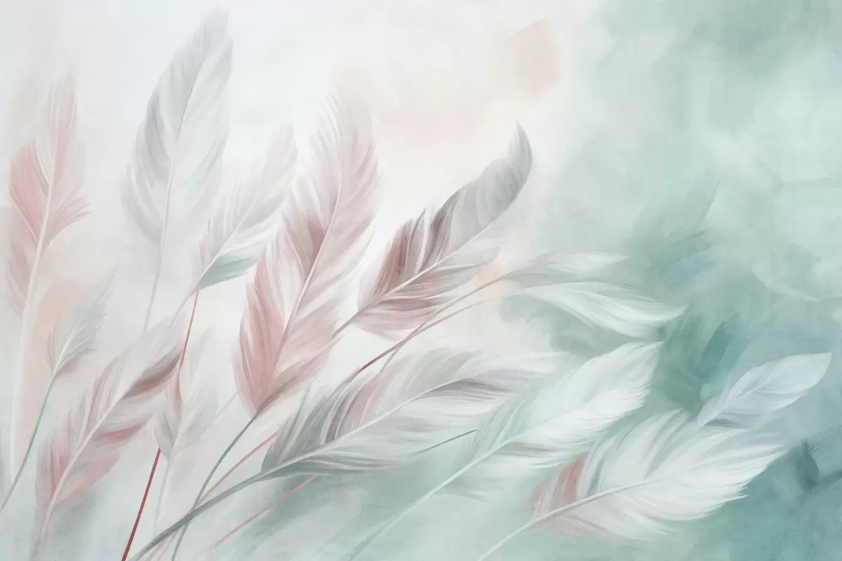 Textured pastel feathers with soft, wispy edges, against a background in watercolor style - Wall mural (No. w09833v1)