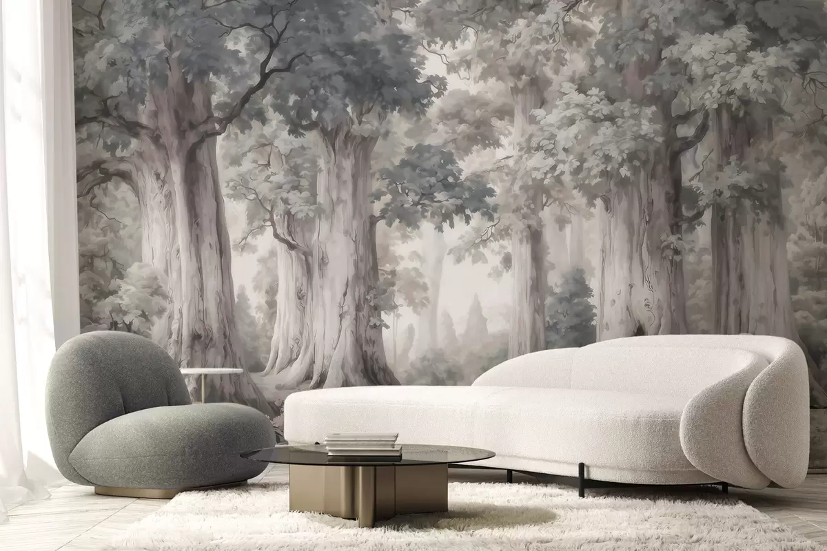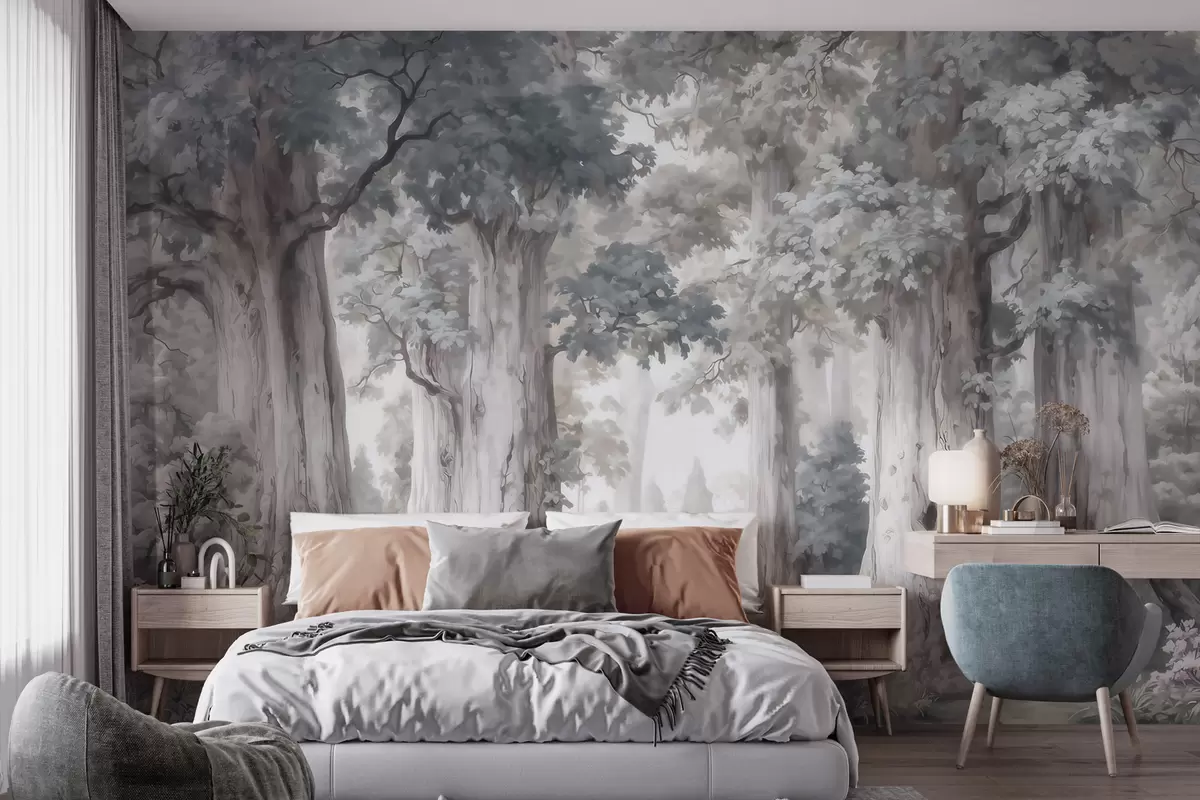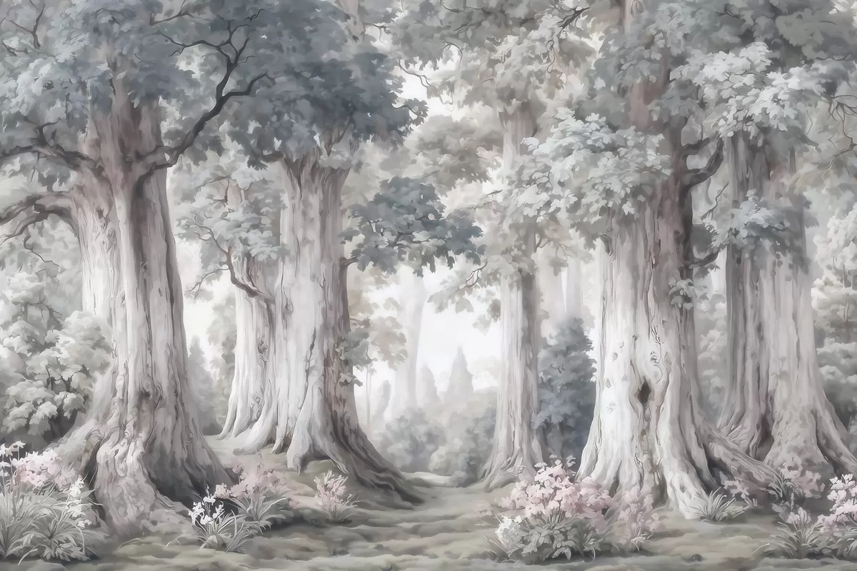 A fairytale forest with tall trees and a gentle muted palette in watercolor style - Wall mural (No. w09849)