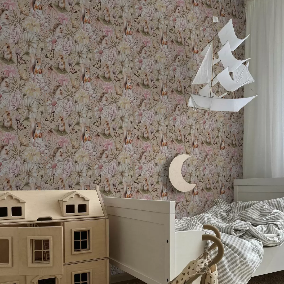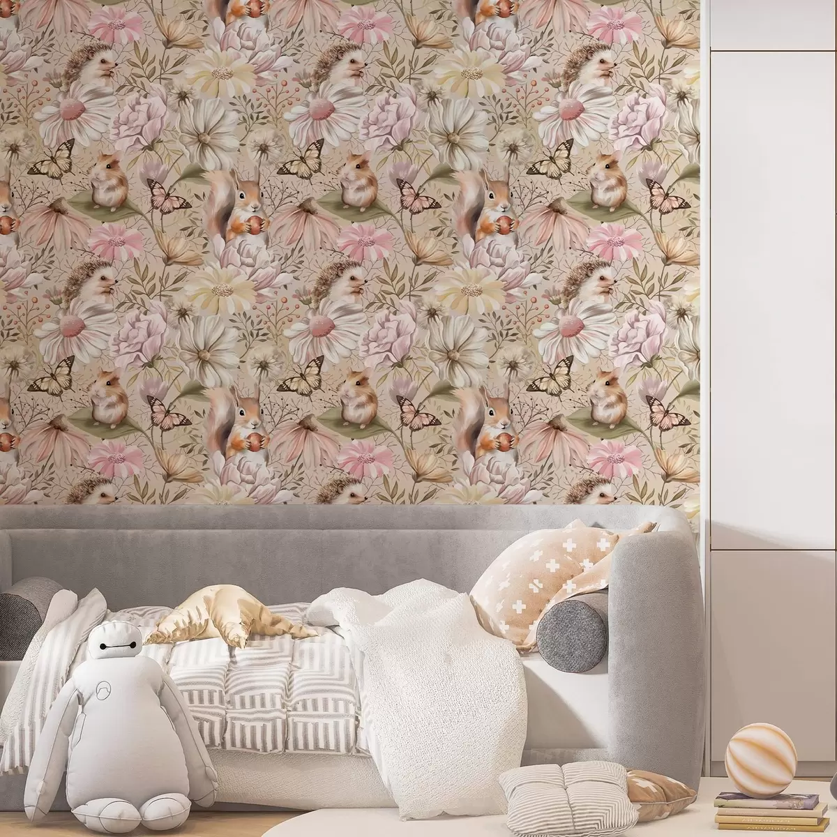 Wallpapers Cute hedgehog, squirrel, hamster and butterflies with flowers in pastel colors No. a00051
