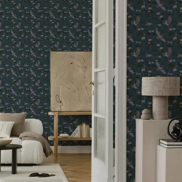 Wallpapers Flamingo among water lilies, tropical scene on navy blue background No. a00237
