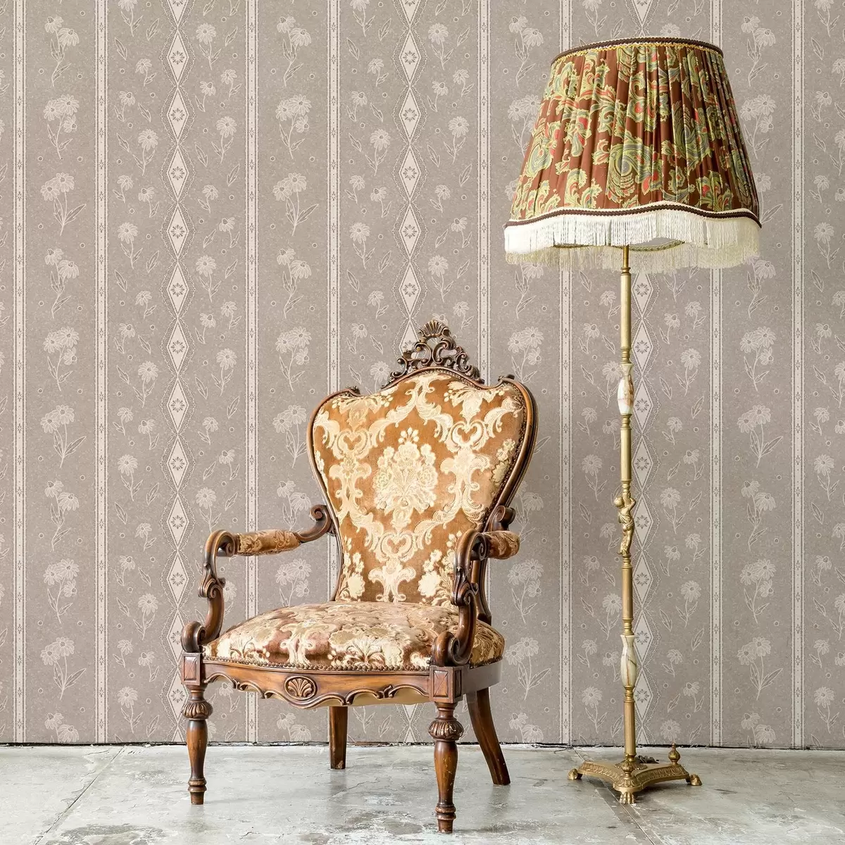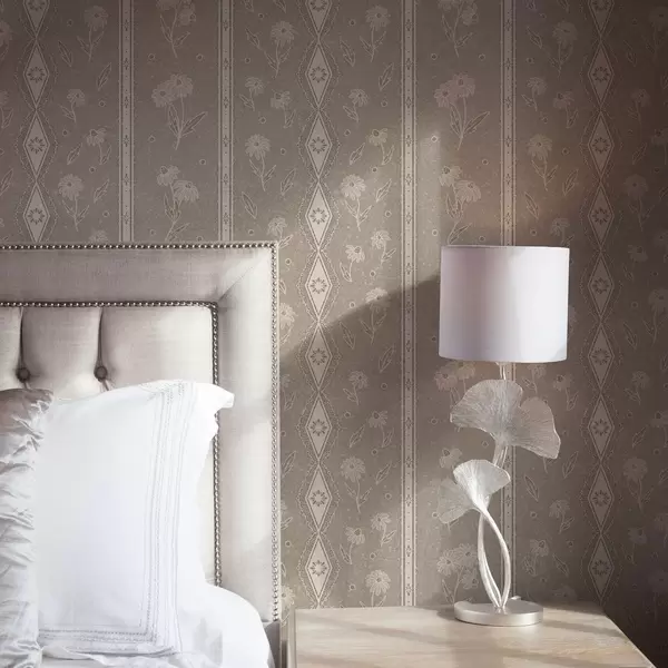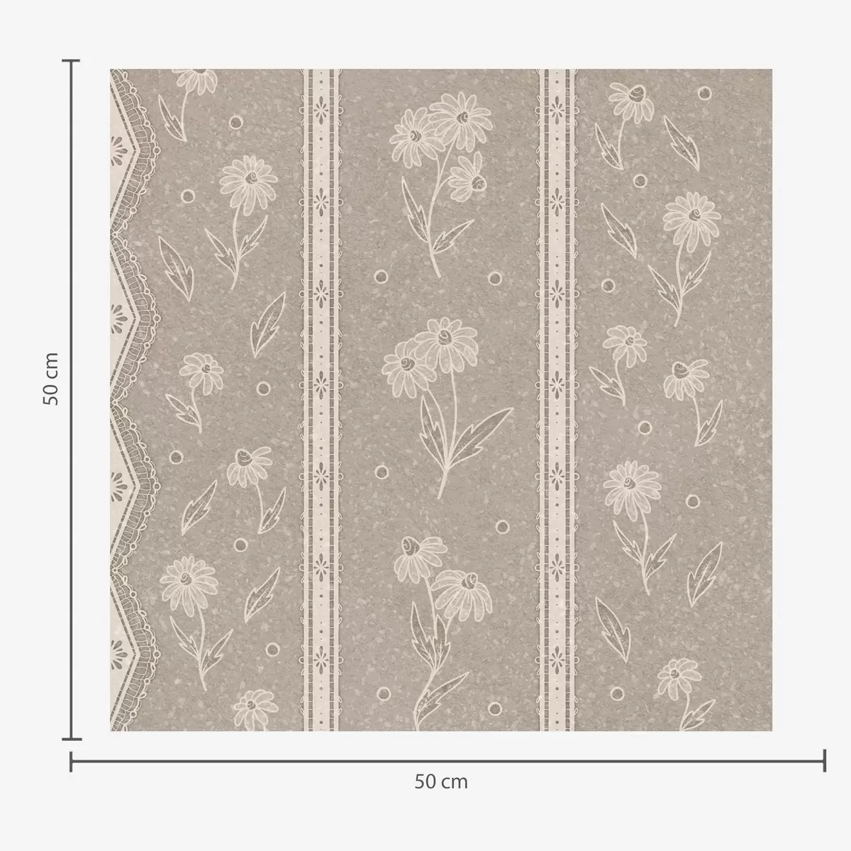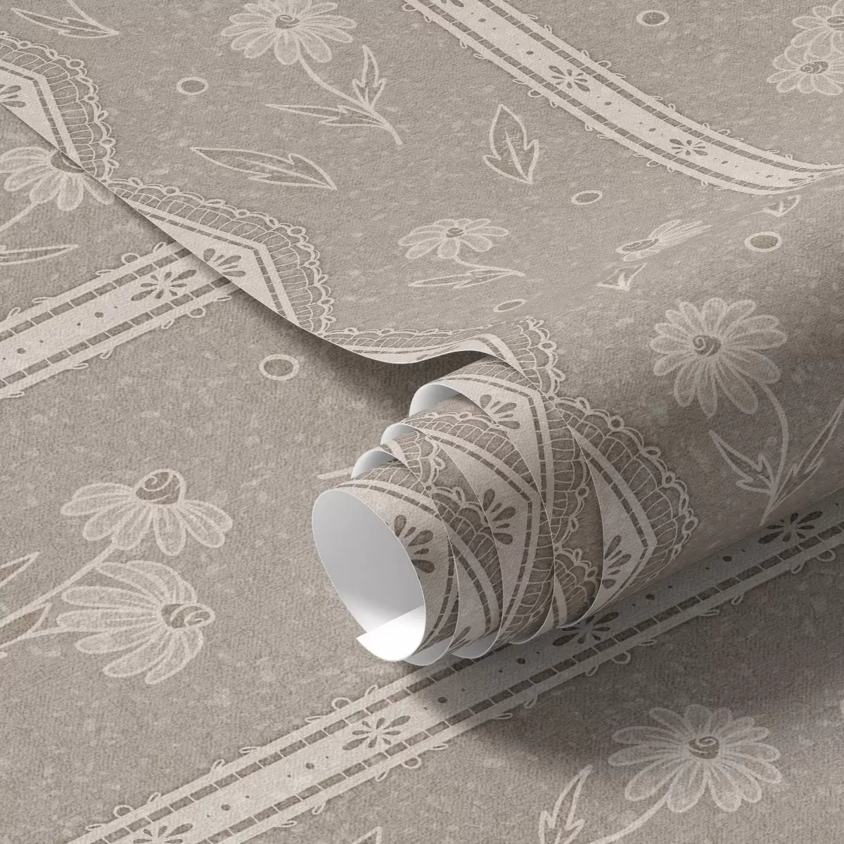 Wallpapers Stripes with daisies and lace on a gray-beige background No. a00295
