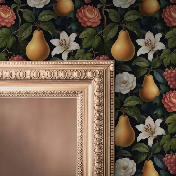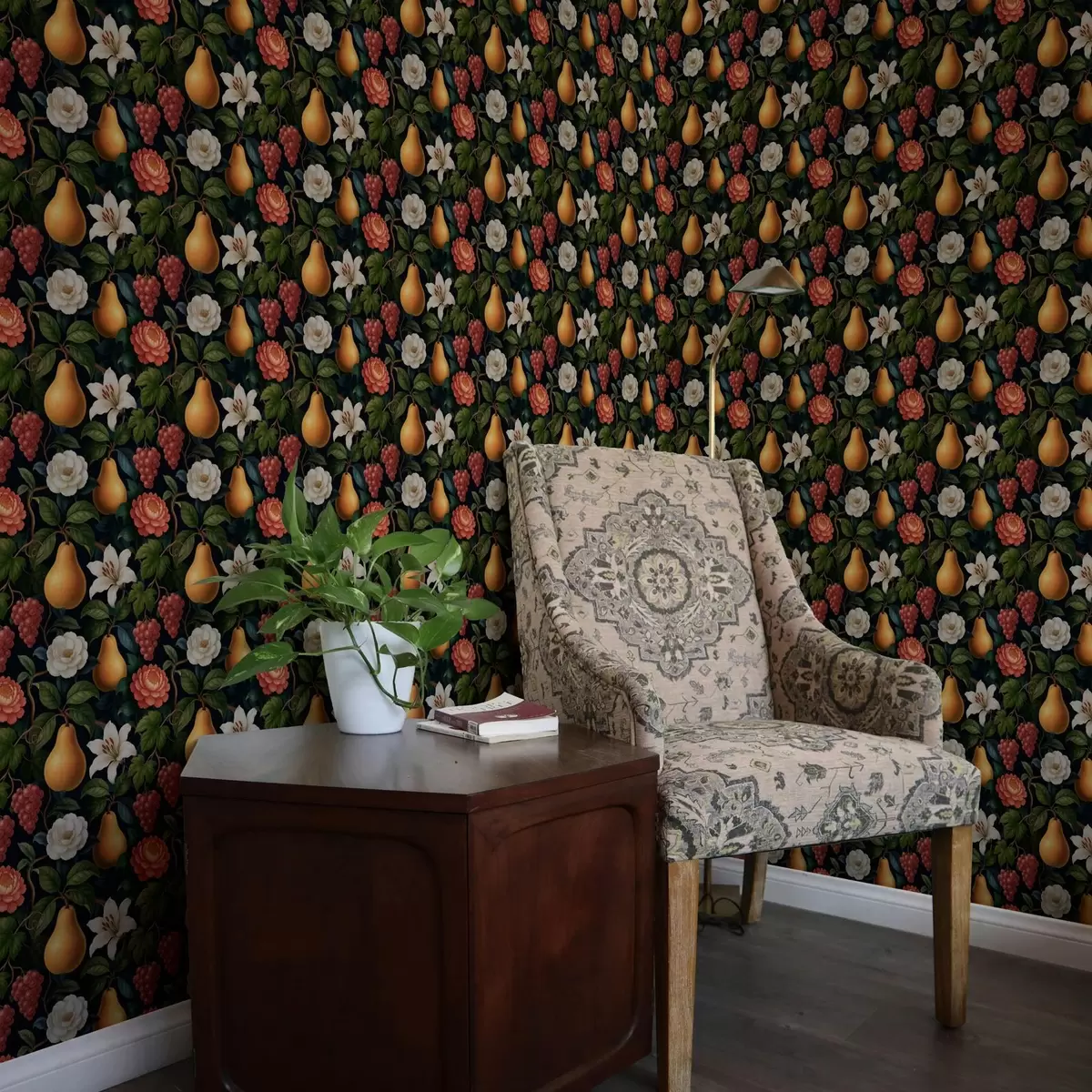 Wallpaper Baroque fruits and flowers on a dramatic dark background a00387