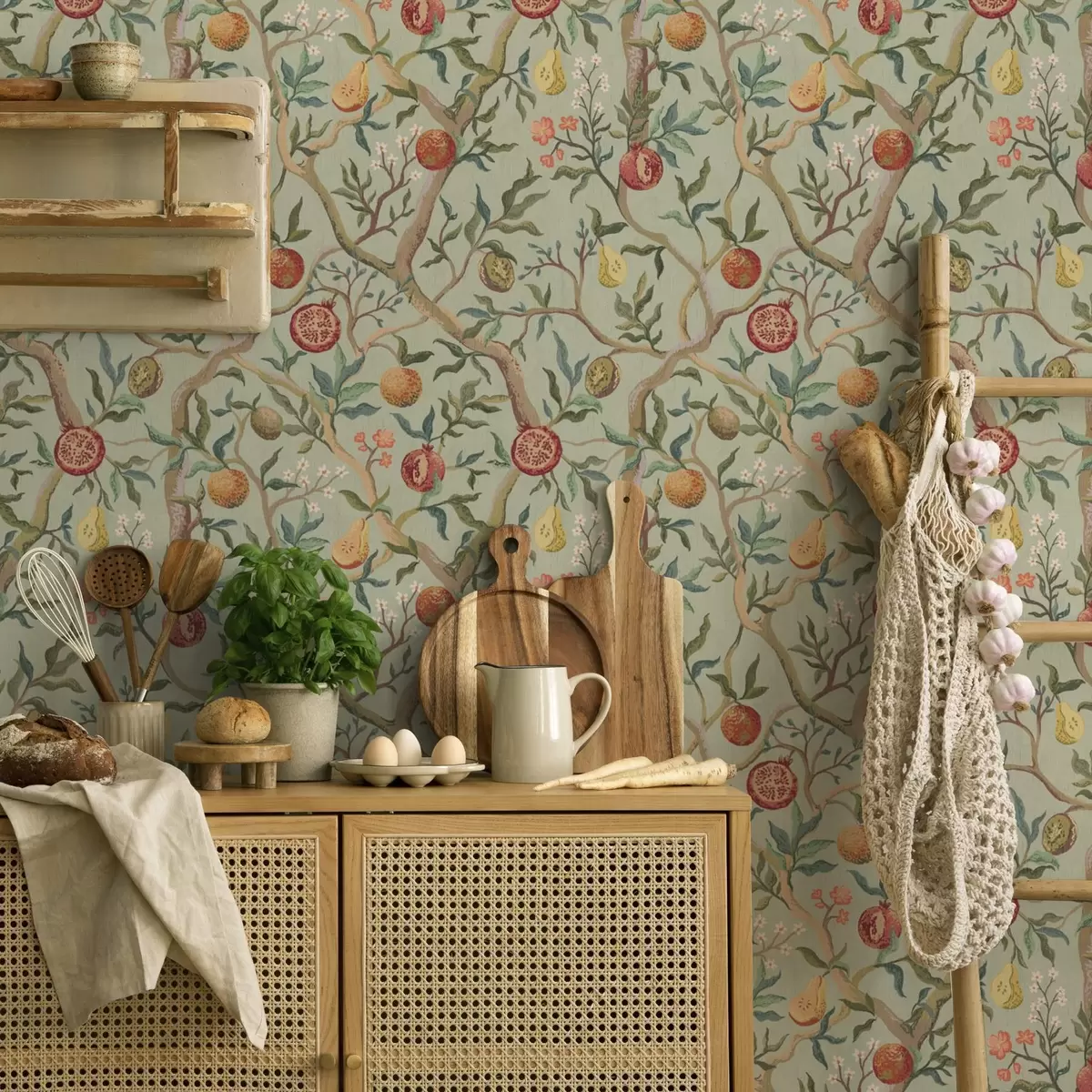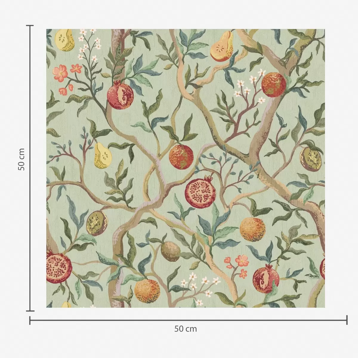 Wallpaper Pomegranate fruits, pears and flowers on a pale green background a00465